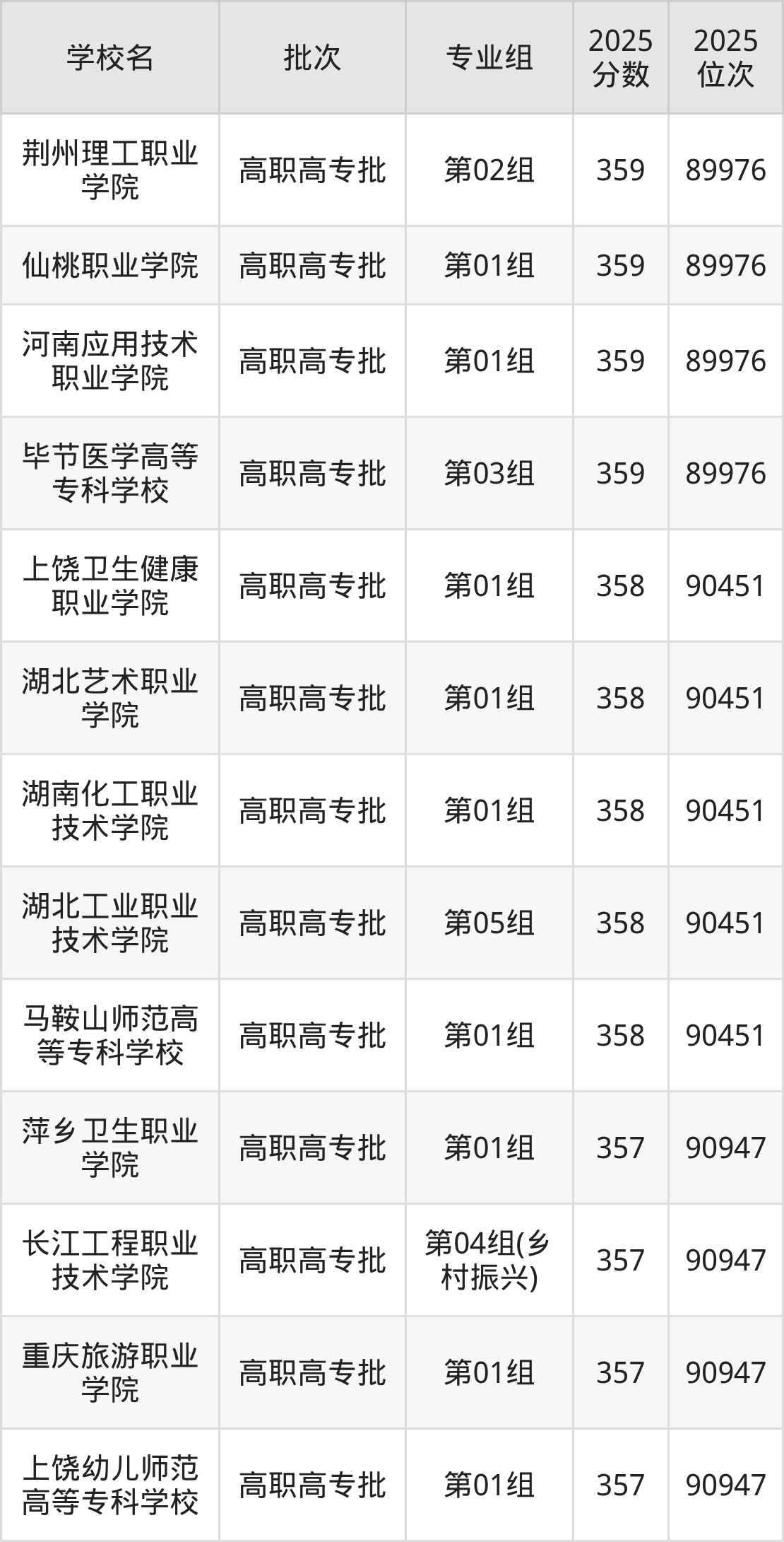 2025年湖北高考历史类358分(89977名~90451名)能上的大学有湖北工业职业技术学院第05组、湖北艺术职业学院第01组、马鞍山师范高等专科学校第01组、上饶卫生健康职业学院第01组等。