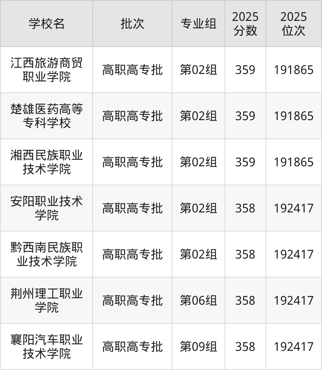 2025年湖北高考物理类358分(191866名~192417名)能上的大学有荆州理工职业学院第06组、襄阳汽车职业技术学院第09组、安阳职业技术学院第02组、黔西南民族职业技术学院第02组。