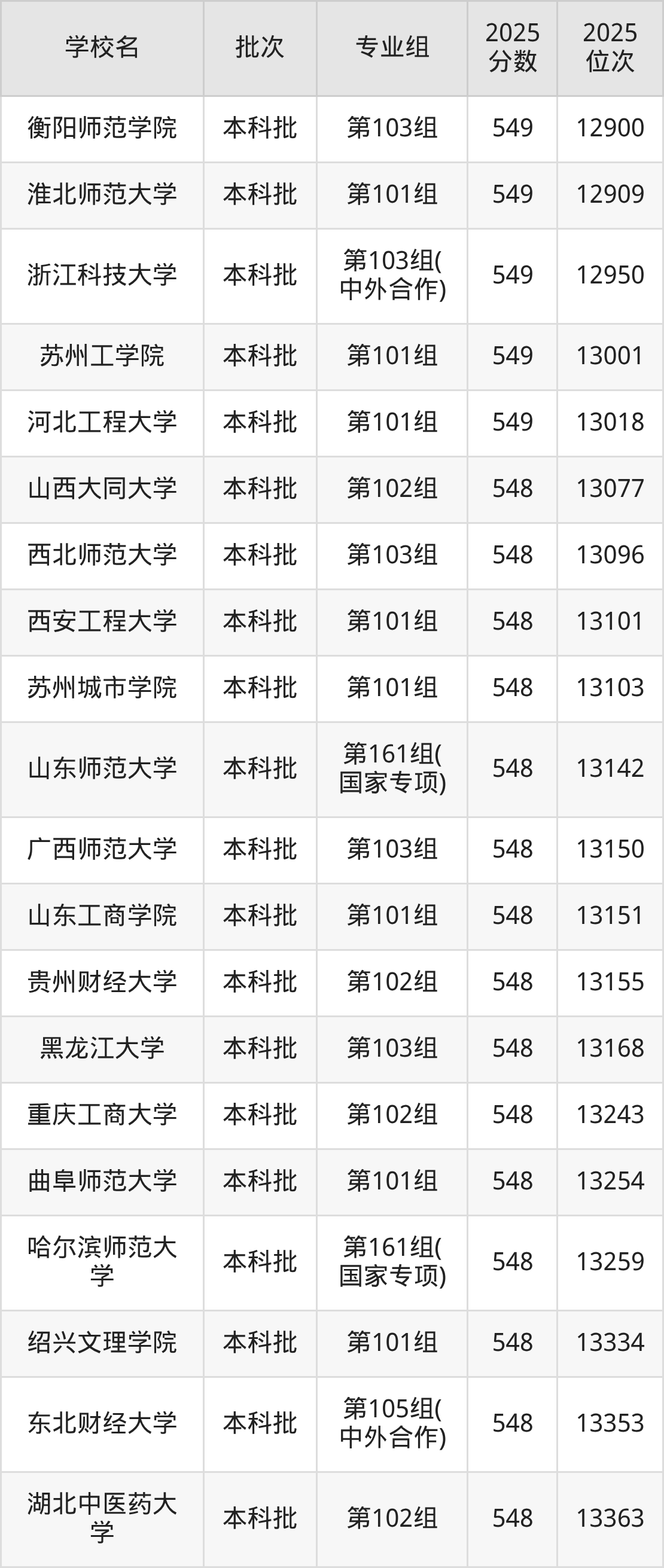 2025年江西高考历史类549分(12709名~13070名)能上的大学有河北工程大学第101组、大连外国语大学第101组、苏州工学院第101组、浙江科技大学第103组(中外合作)等。