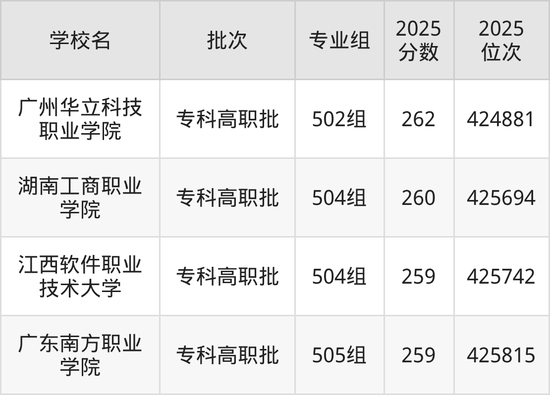 2025年广东高考物理类261分(424988名~425334名)录取位次低于该区间(较稳妥)的有湖南工商职业学院504组(425694名)、江西软件职业技术大学504组(425742名)等;录取位次高于该区间(可冲)的有广州华立科技职业学院502组(424881名)、广东岭南职业技术学院510组(424467名)等。