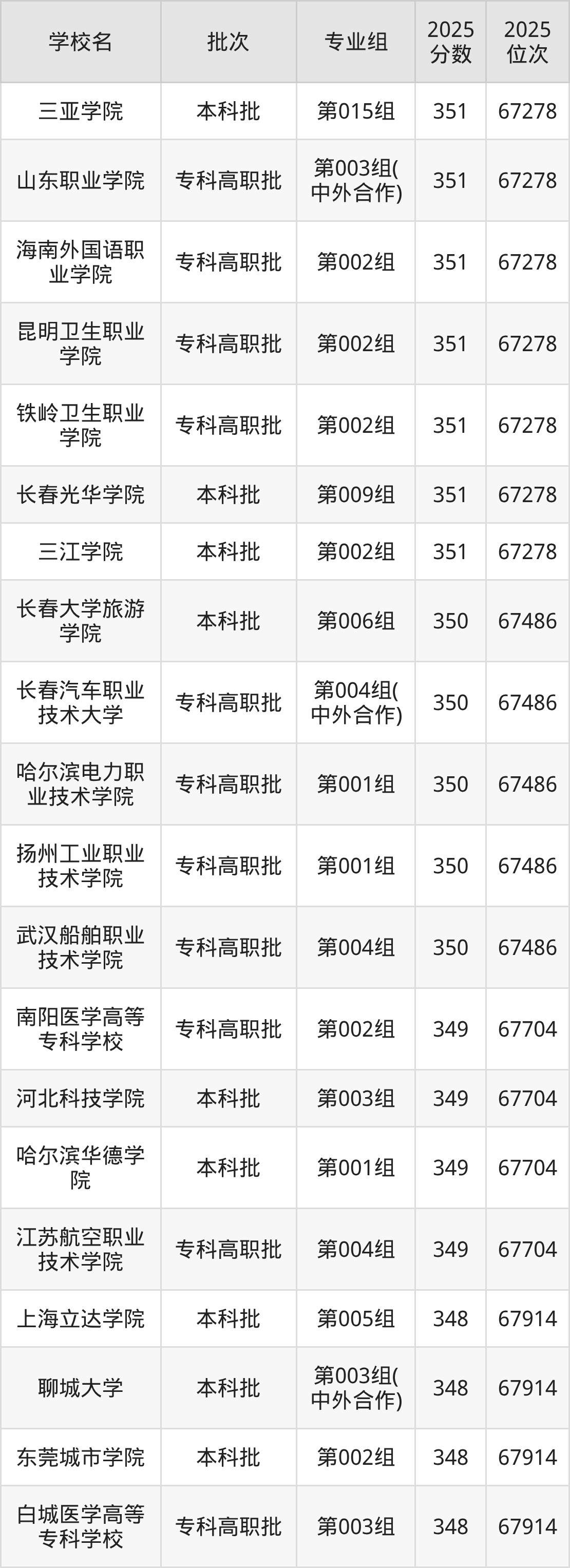 2025年吉林高考物理类348分(67705名~67914名)能上的大学有上海立达学院第005组、聊城大学第003组(中外合作)、东莞城市学院第002组、白城医学高等专科学校第003组等。