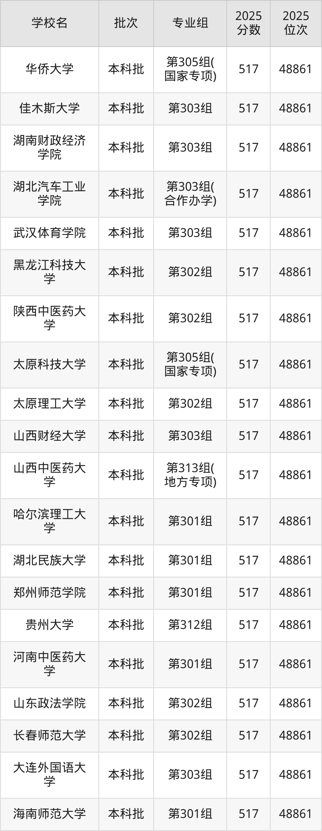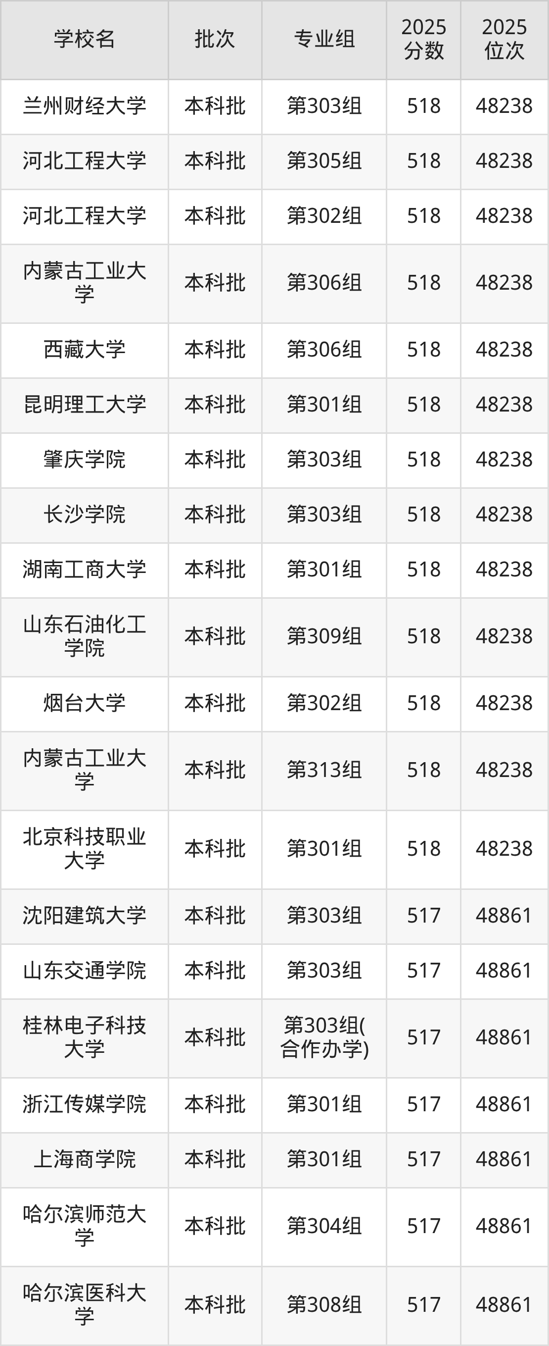 2025年山西高考物理类517分(48239名~48861名)能上的大学有沈阳建筑大学第303组、大连外国语大学第303组、长春师范大学第302组、哈尔滨理工大学第301组等。