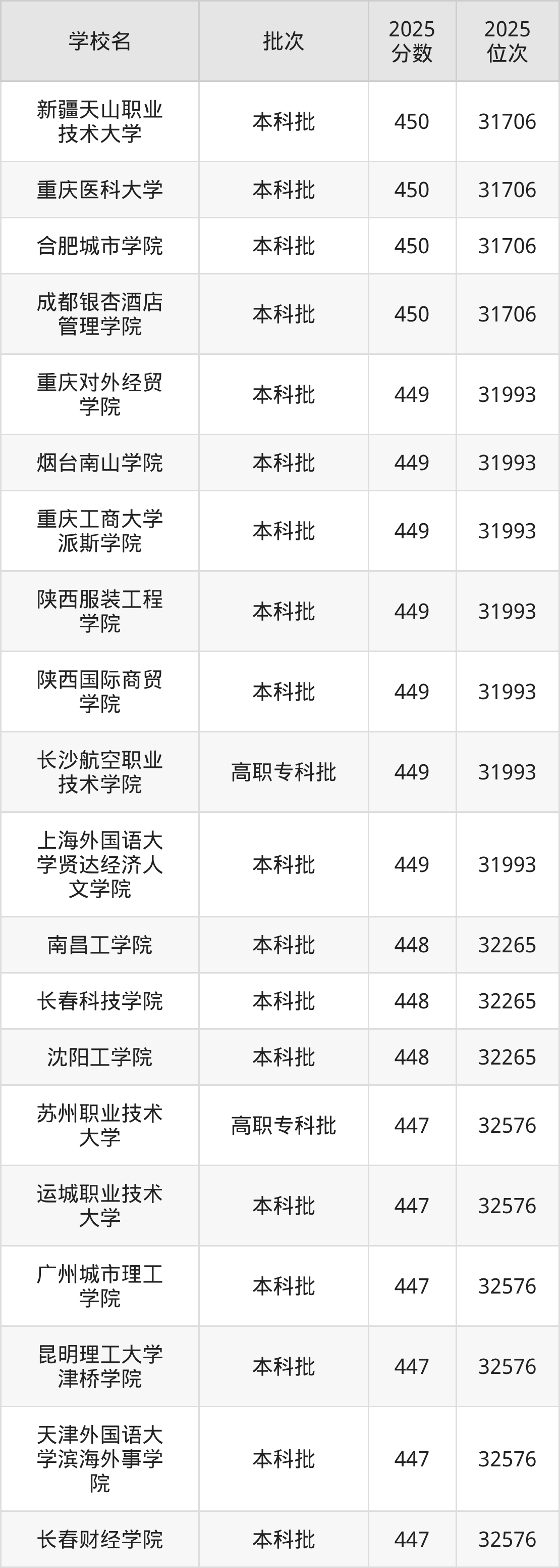 2025年重庆高考历史类448分(31994名~32265名)能上的大学有沈阳工学院、长春科技学院、南昌工学院。