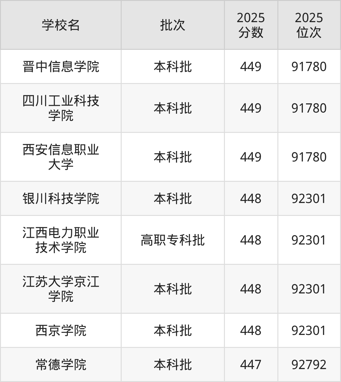 2025年重庆高考物理类448分(91781名~92301名)能上的大学有西京学院、江苏大学京江学院、江西电力职业技术学院、银川科技学院。