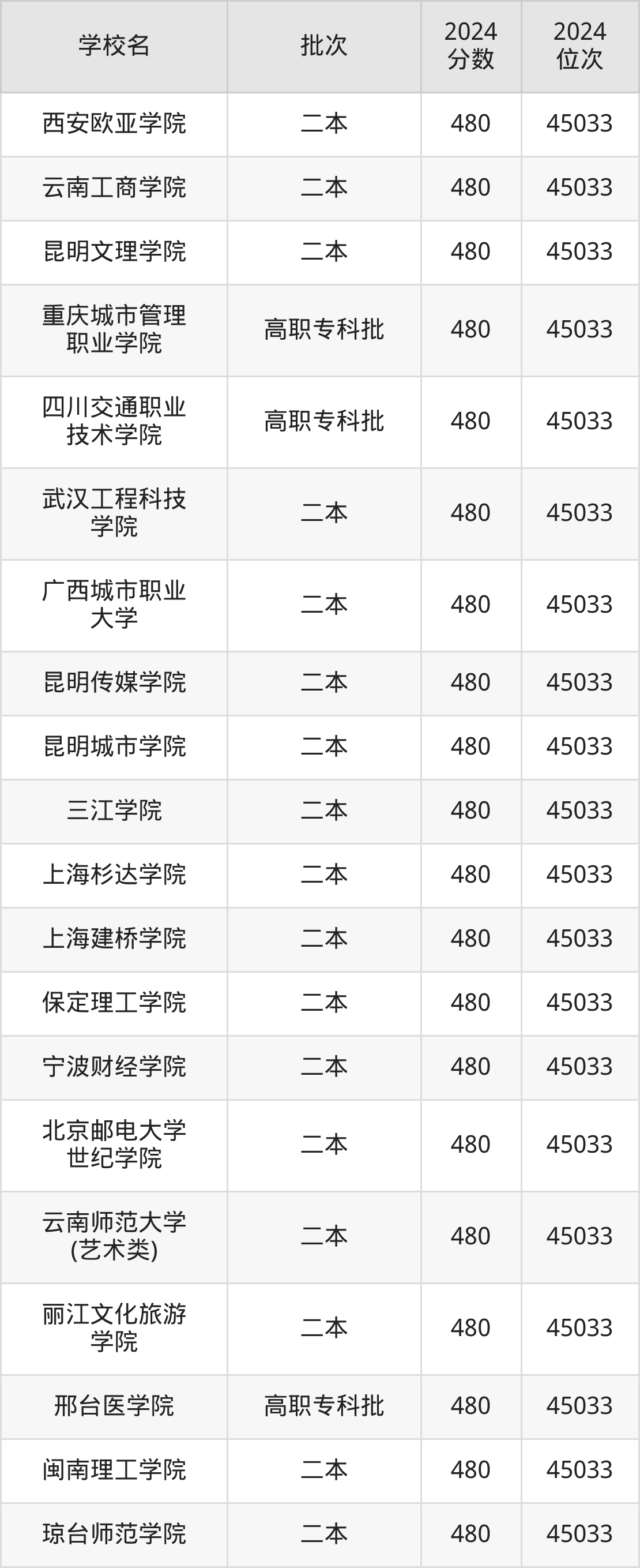 云南高考480分:文科排名45033位、理科排名63338位。该分数位次对应能上的大学文科有长春财经学院、仰恩大学;理科有黑龙江中医药大学、遵义医科大学医学与科技学院,更多名单如下文所示,2025届考生可参考。