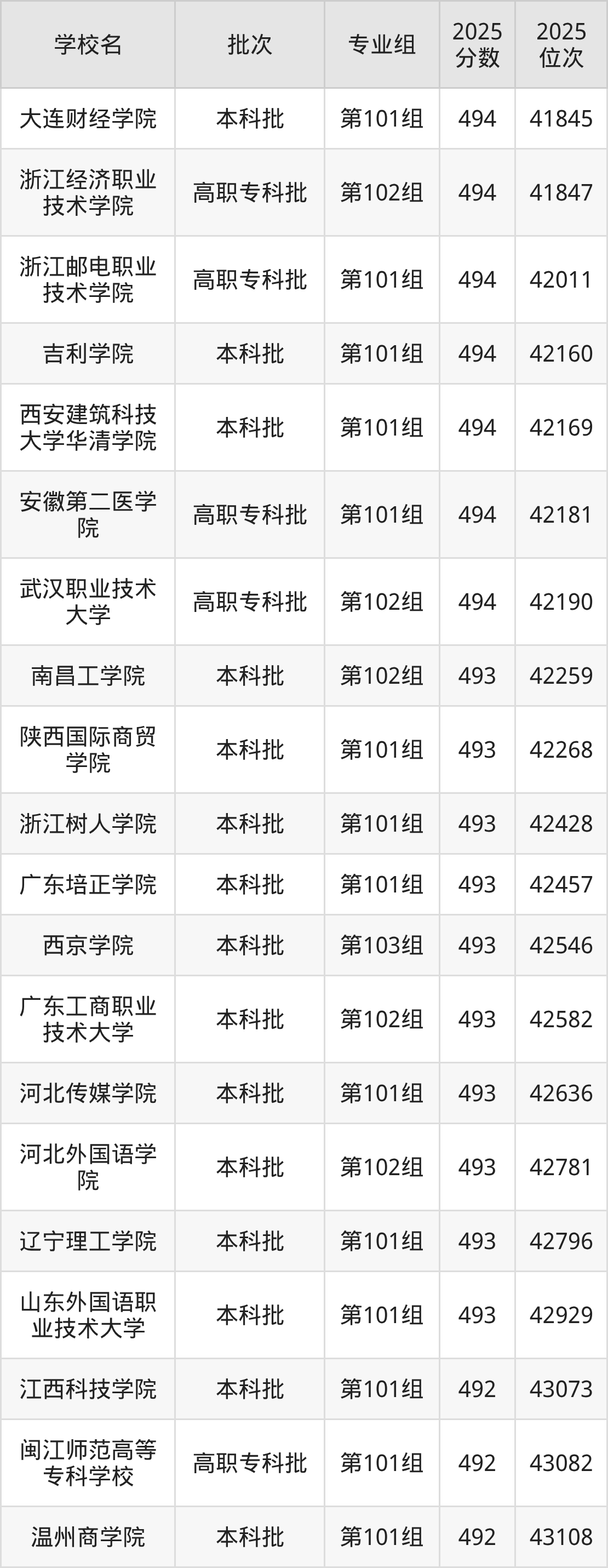 2025年江西高考历史类493分(42251名~42934名)能上的大学有河北传媒学院第101组、山东外国语职业技术大学第101组、辽宁理工学院第101组、浙江树人学院第101组等。