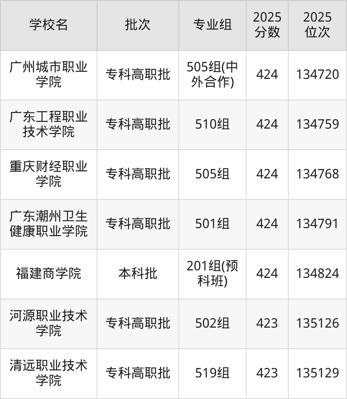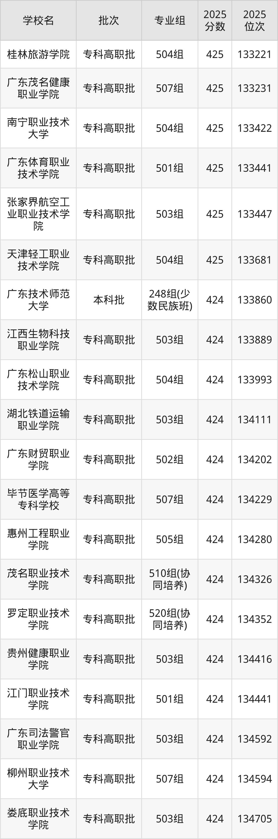 2025年广东高考历史类424分(133715名~134847名)能上的大学有广东技术师范大学248组(少数民族班)、福建商学院201组(预科班)、广东松山职业技术学院504组、柳州职业技术大学507组等。