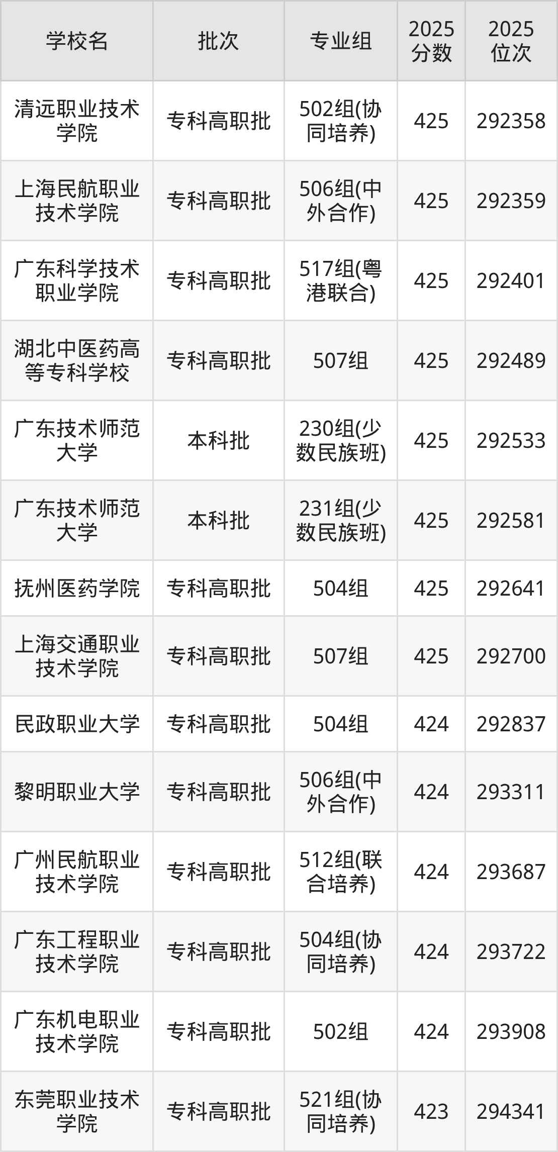 另外录取位次低于该区间(较稳妥)的有东莞职业技术学院521组(协同培养)(294341名)、中山职业技术学院505组(294641名)等;录取位次高于该区间(可冲)的有上海交通职业技术学院507组(292700名)、抚州医药学院504组(292641名)等。