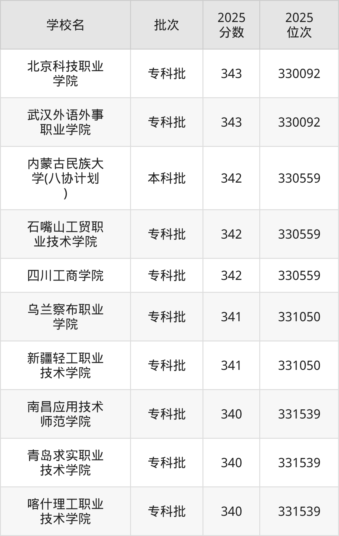 2025年河北高考物理类341分(330560名~331050名)能上的大学有新疆轻工职业技术学院、乌兰察布职业学院。