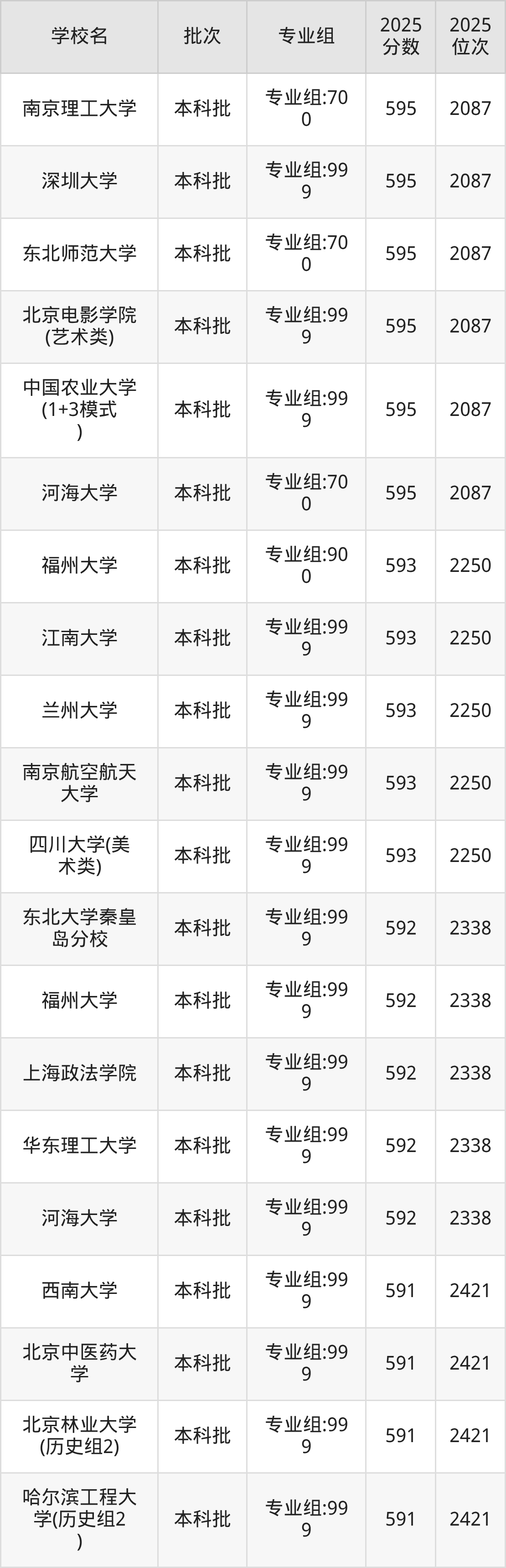 2025年福建高考历史类592分(2251名~2338名)能上的大学有福州大学专业组:999、东北大学秦皇岛分校专业组:999、河海大学专业组:999、华东理工大学专业组:999等。