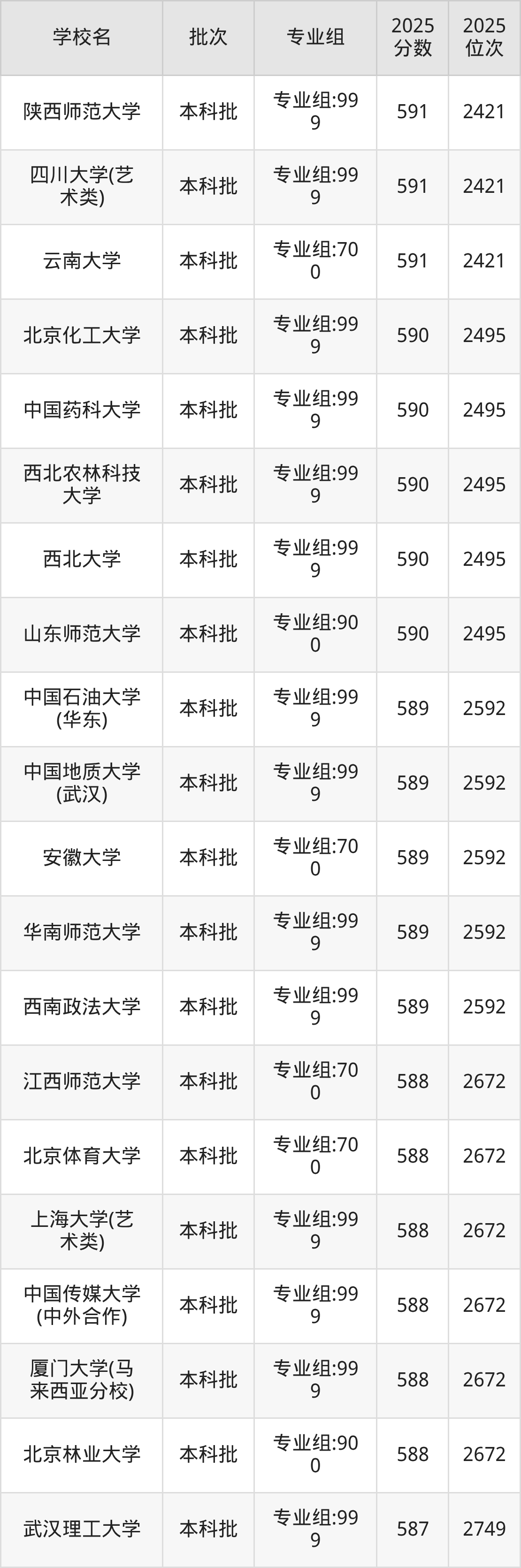 另外录取位次低于该区间(较稳妥)的有北京林业大学(历史组2)专业组:999(2421名)、西南大学专业组:999(2421名)等;录取位次高于该区间(可冲)的有四川大学(美术类)专业组:999(2250名)、兰州大学专业组:999(2250名)等。