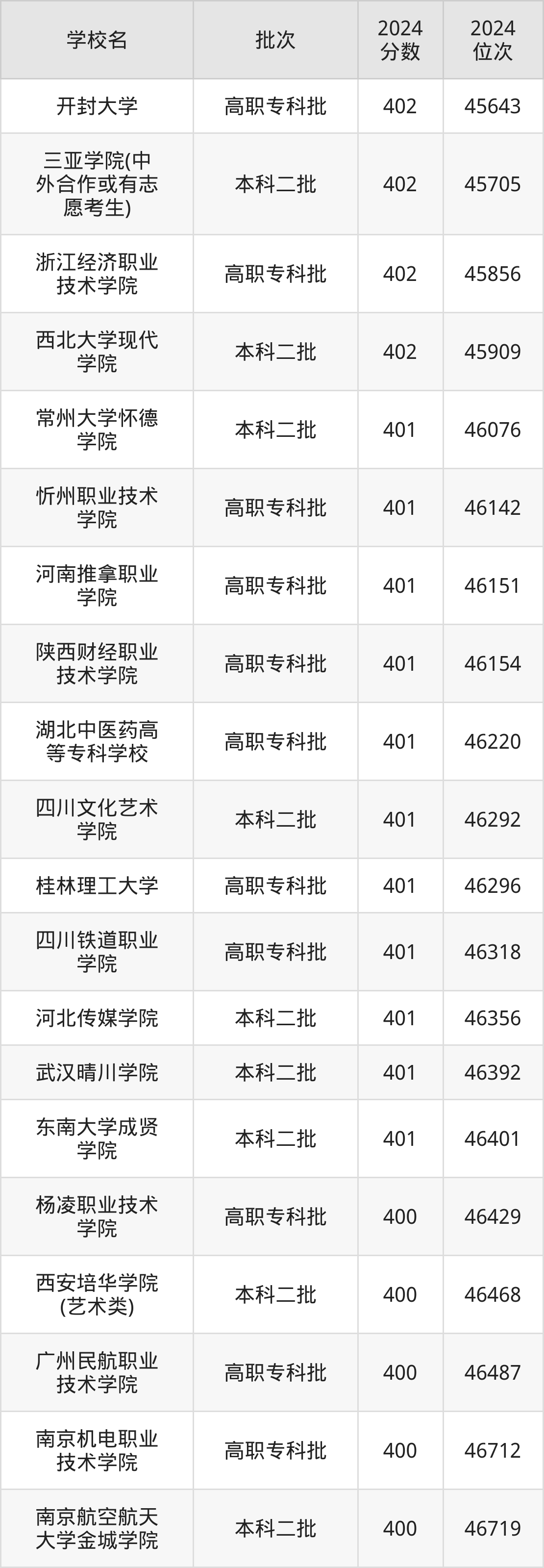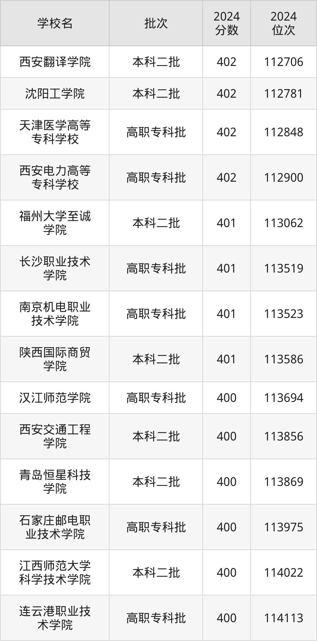 2024年陕西高考理科401分(112939名~113654名)能上的大学有南京机电职业技术学院、福州大学至诚学院、长沙职业技术学院、陕西国际商贸学院。