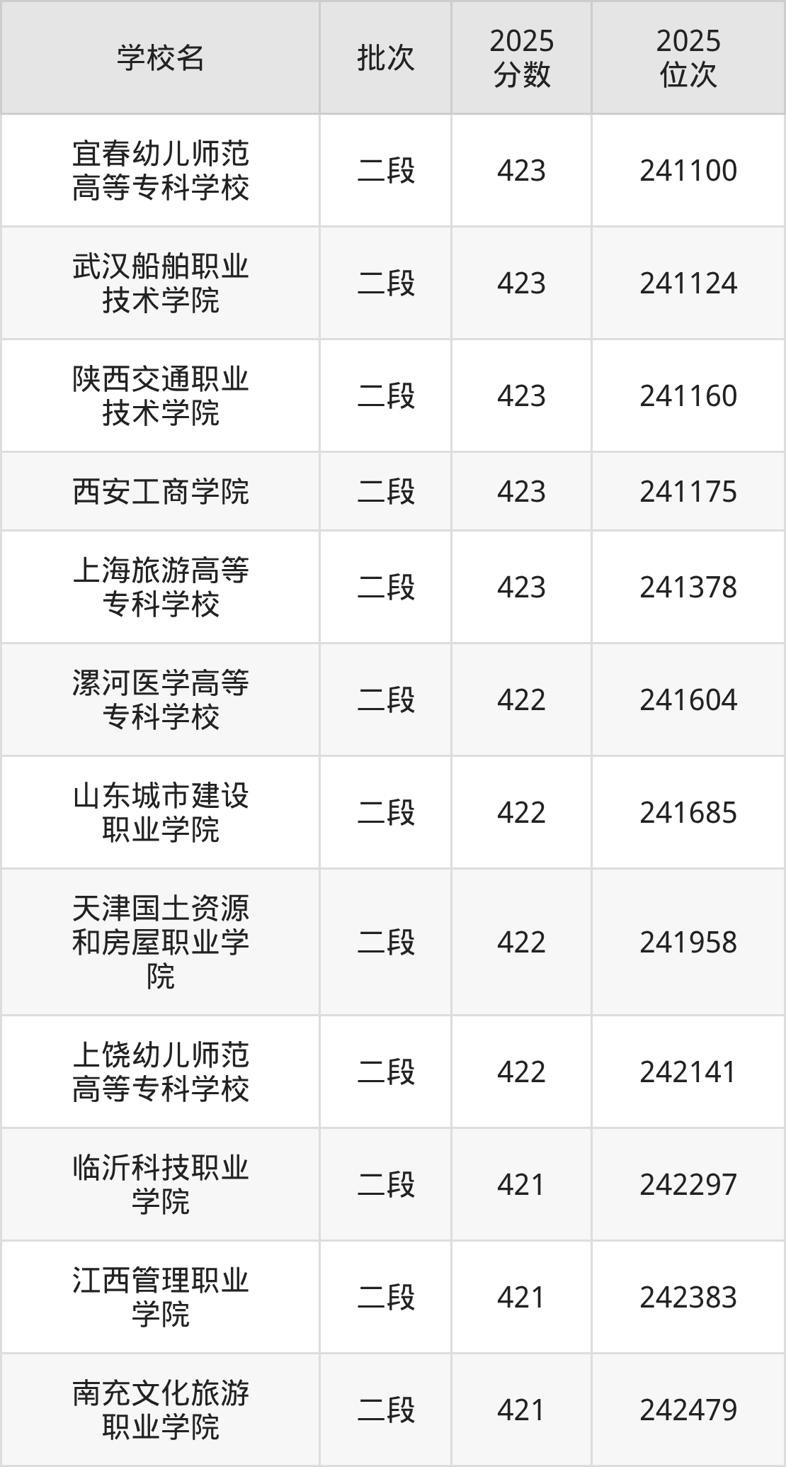 2025年浙江高考422分(241579名~242196名)能上的大学有漯河医学高等专科学校、上饶幼儿师范高等专科学校、山东城市建设职业学院、天津国土资源和房屋职业学院。