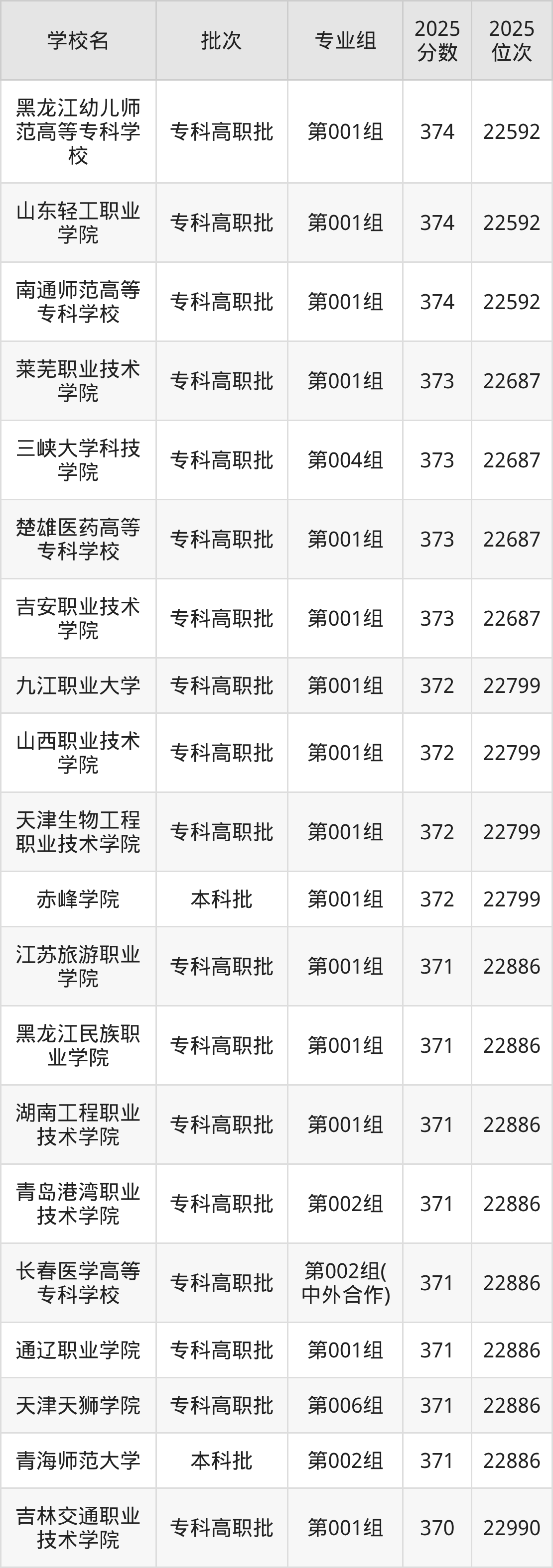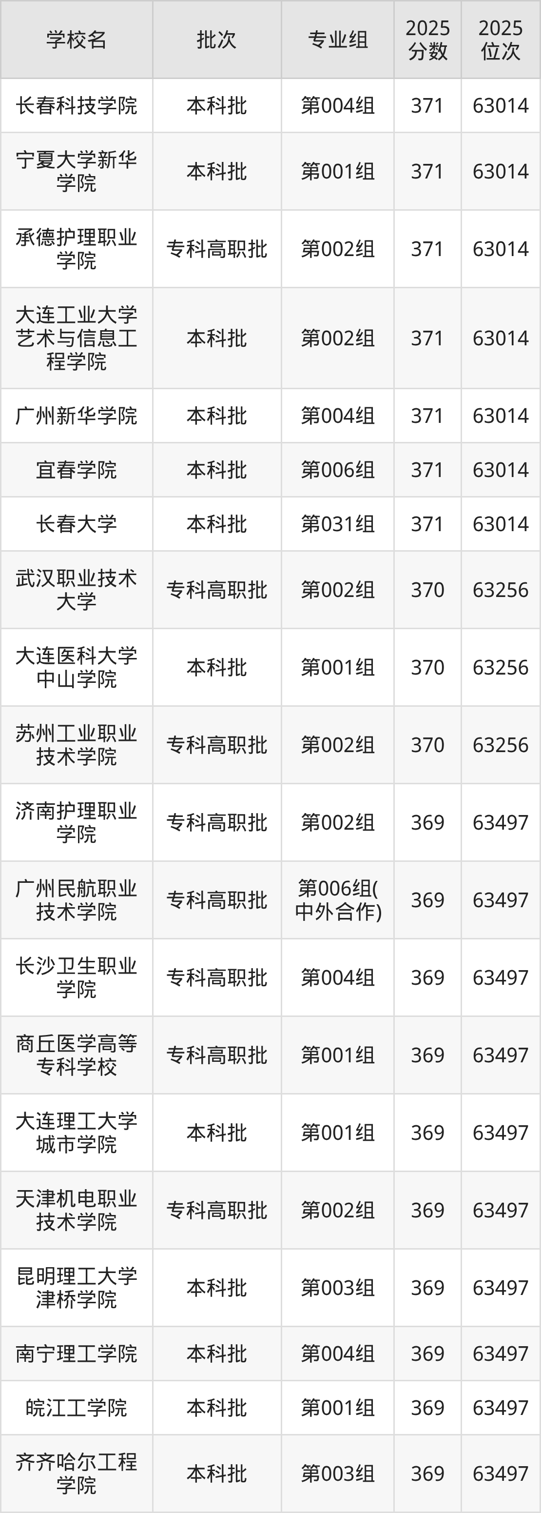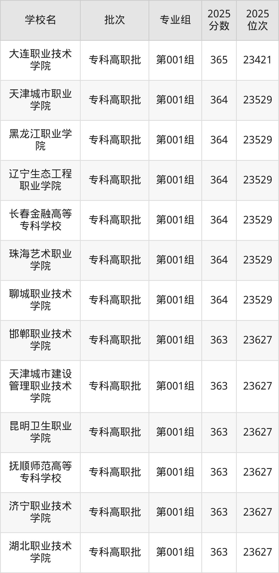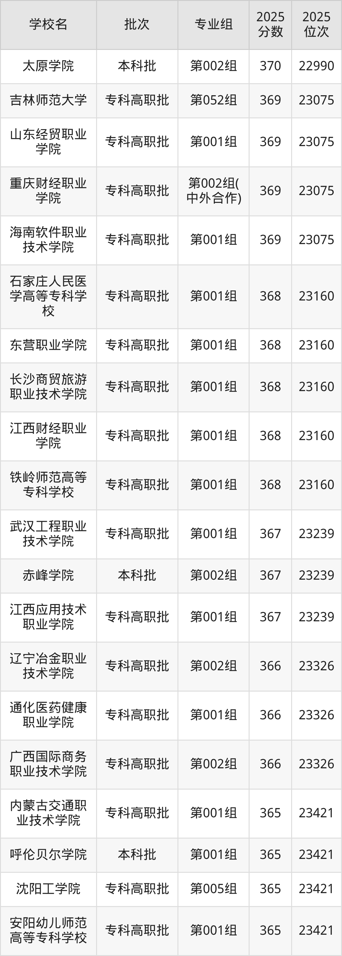 2025年吉林高考历史类368分(23076名~23160名)能上的大学有石家庄人民医学高等专科学校第001组、铁岭师范高等专科学校第001组、江西财经职业学院第001组、东营职业学院第001组等。