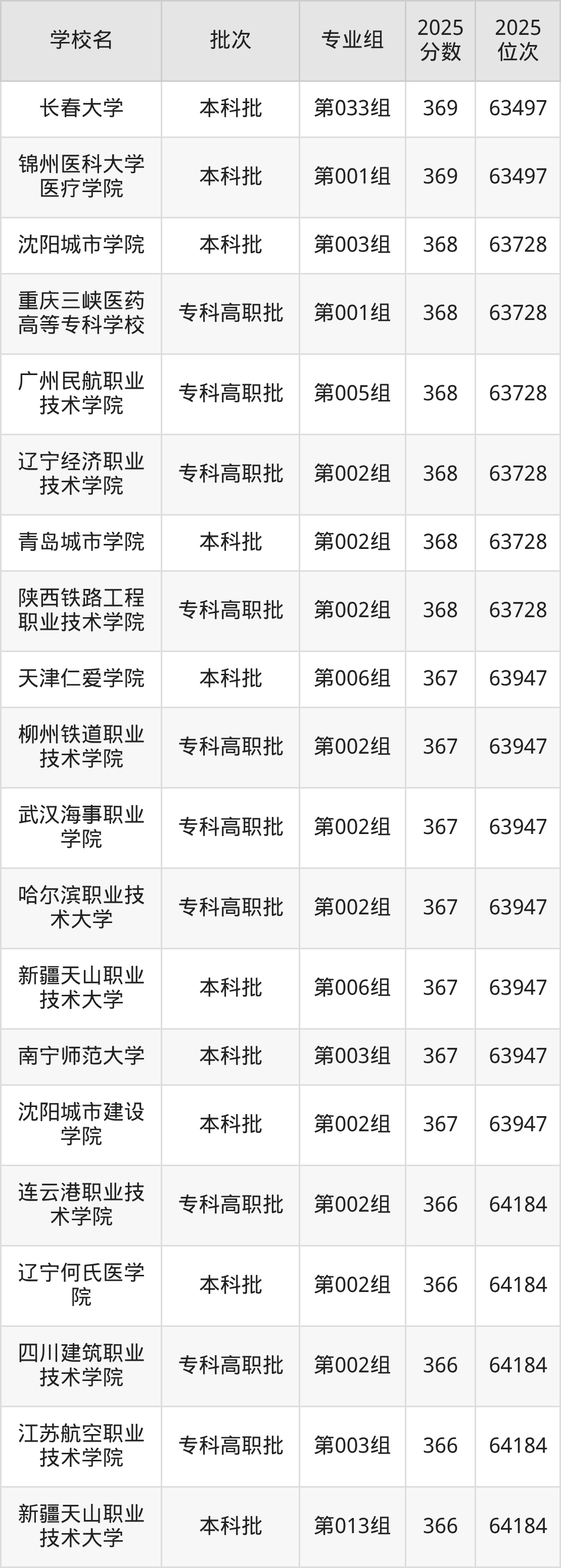 2025年吉林高考物理类368分(63498名~63728名)能上的大学有沈阳城市学院第003组、青岛城市学院第002组、辽宁经济职业技术学院第002组、广州民航职业技术学院第005组等。