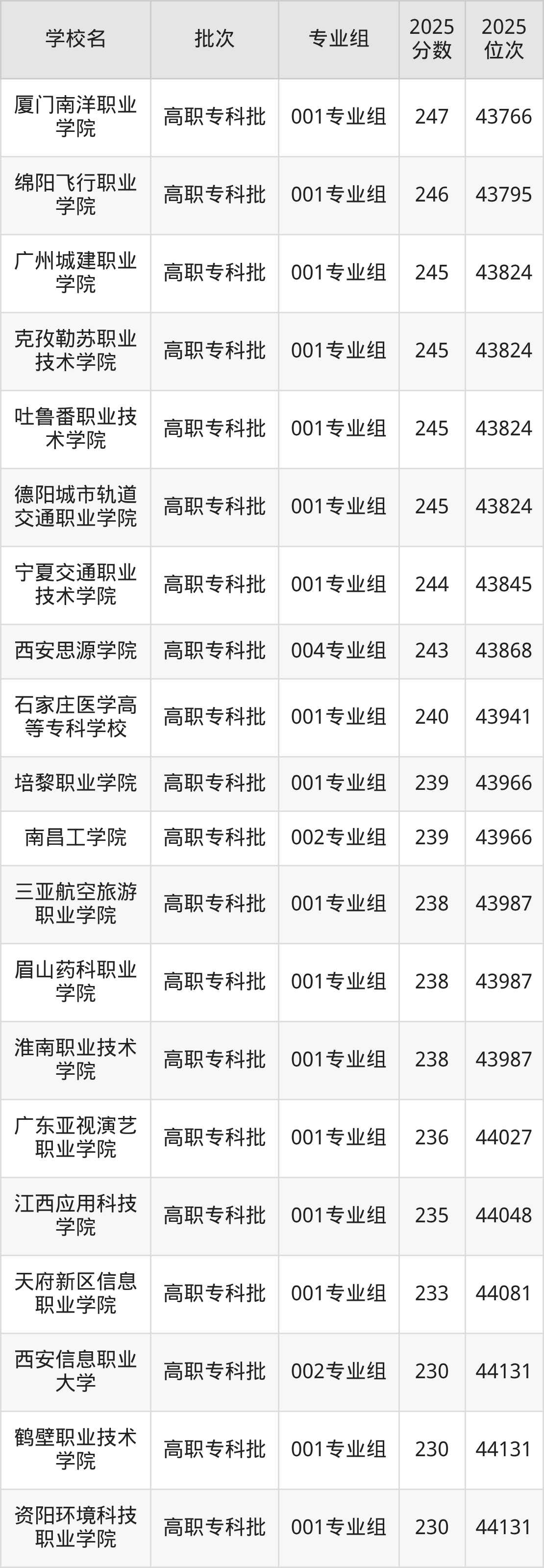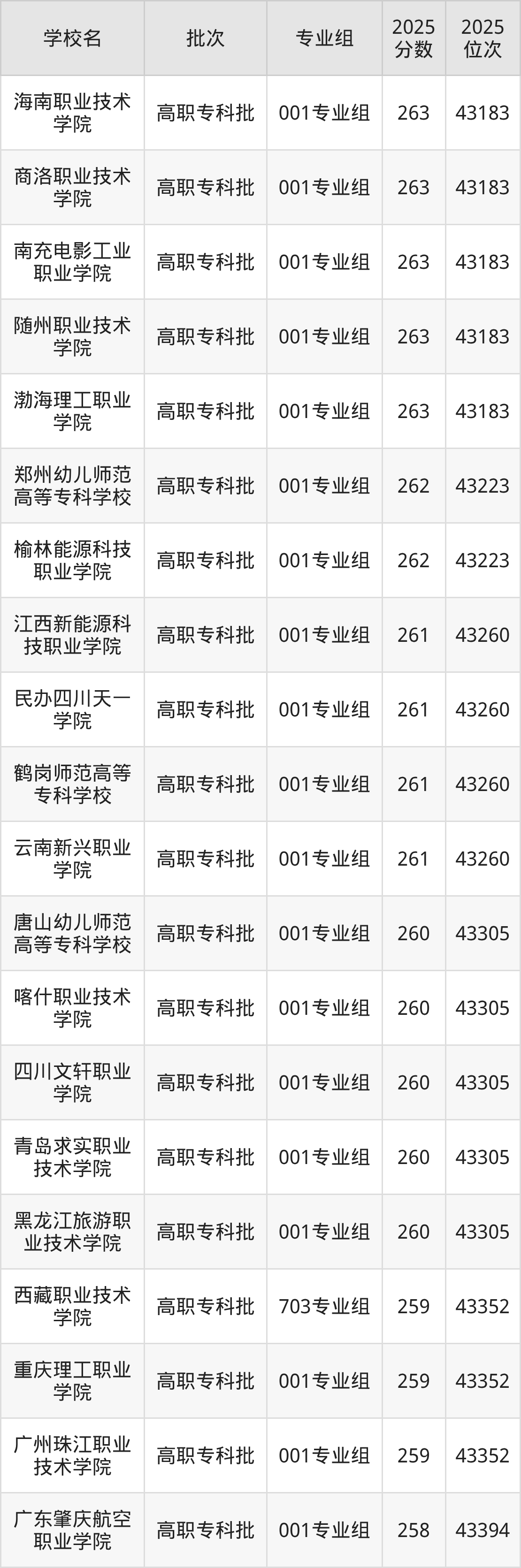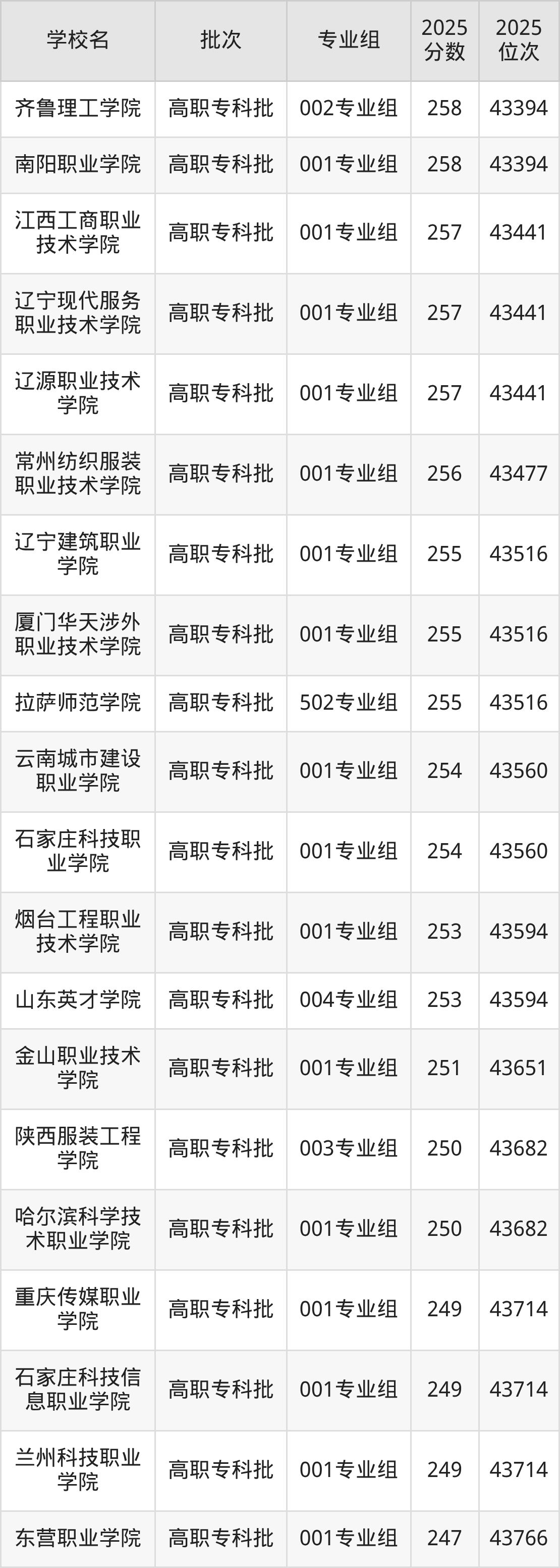 另外录取位次低于该区间(较稳妥)的有东营职业学院001专业组(43766名)、厦门南洋职业学院001专业组(43766名)等;录取位次高于该区间(可冲)的有哈尔滨科学技术职业学院001专业组(43682名)、陕西服装工程学院003专业组(43682名)等。