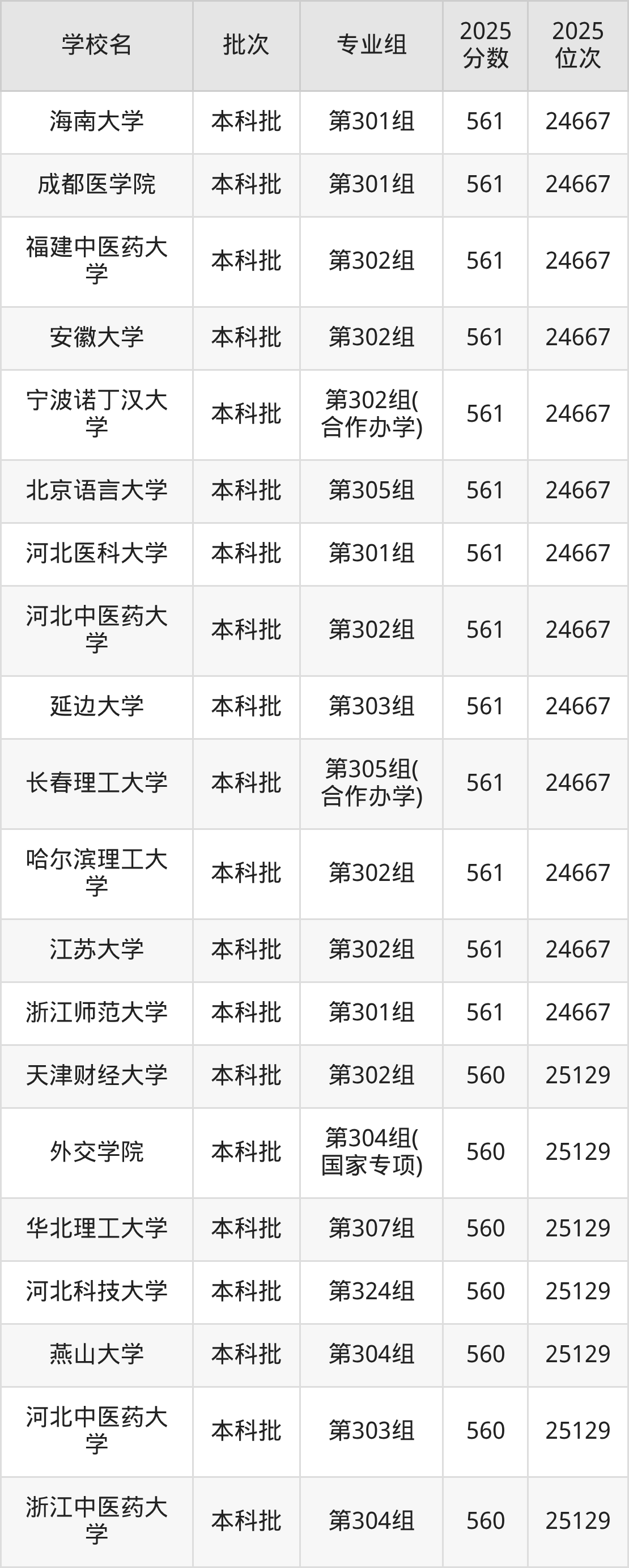 2025年山西高考物理类560分(24668名~25129名)能上的大学有外交学院第304组(国家专项)、天津财经大学第302组、华北理工大学第307组、河北科技大学第324组等。