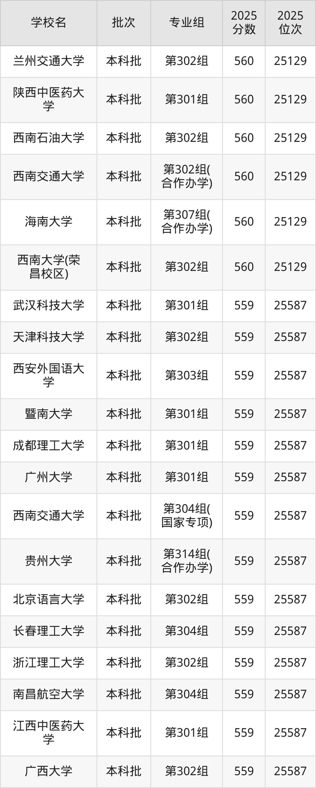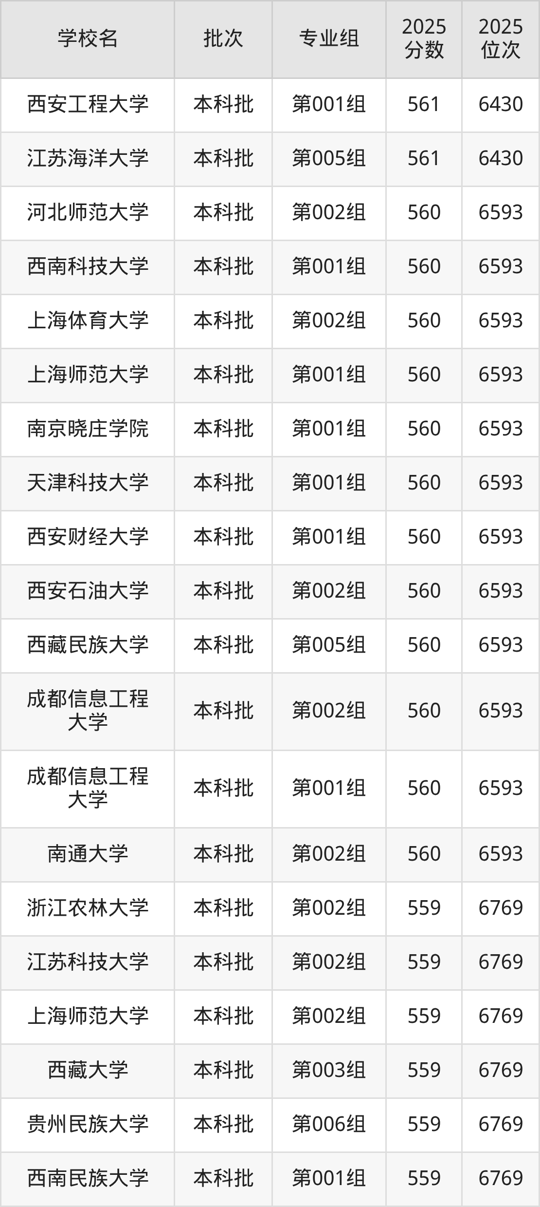 2025年山西高考历史类560分(6431名~6593名)能上的大学有天津科技大学第001组、河北师范大学第002组、上海师范大学第001组、上海体育大学第002组等。