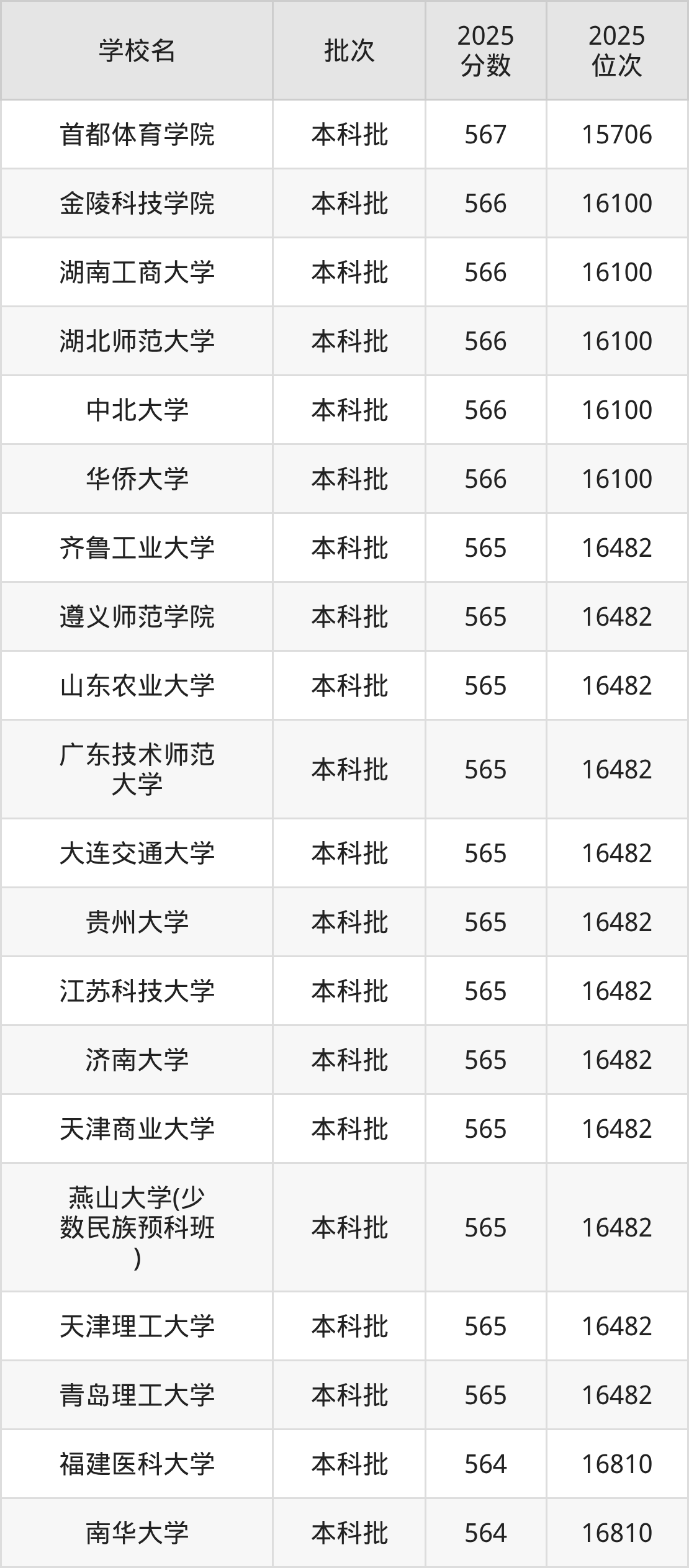 2025年河北高考历史类565分(16101名~16482名)能上的大学有江苏科技大学、燕山大学(少数民族预科班)、青岛理工大学、大连交通大学等。