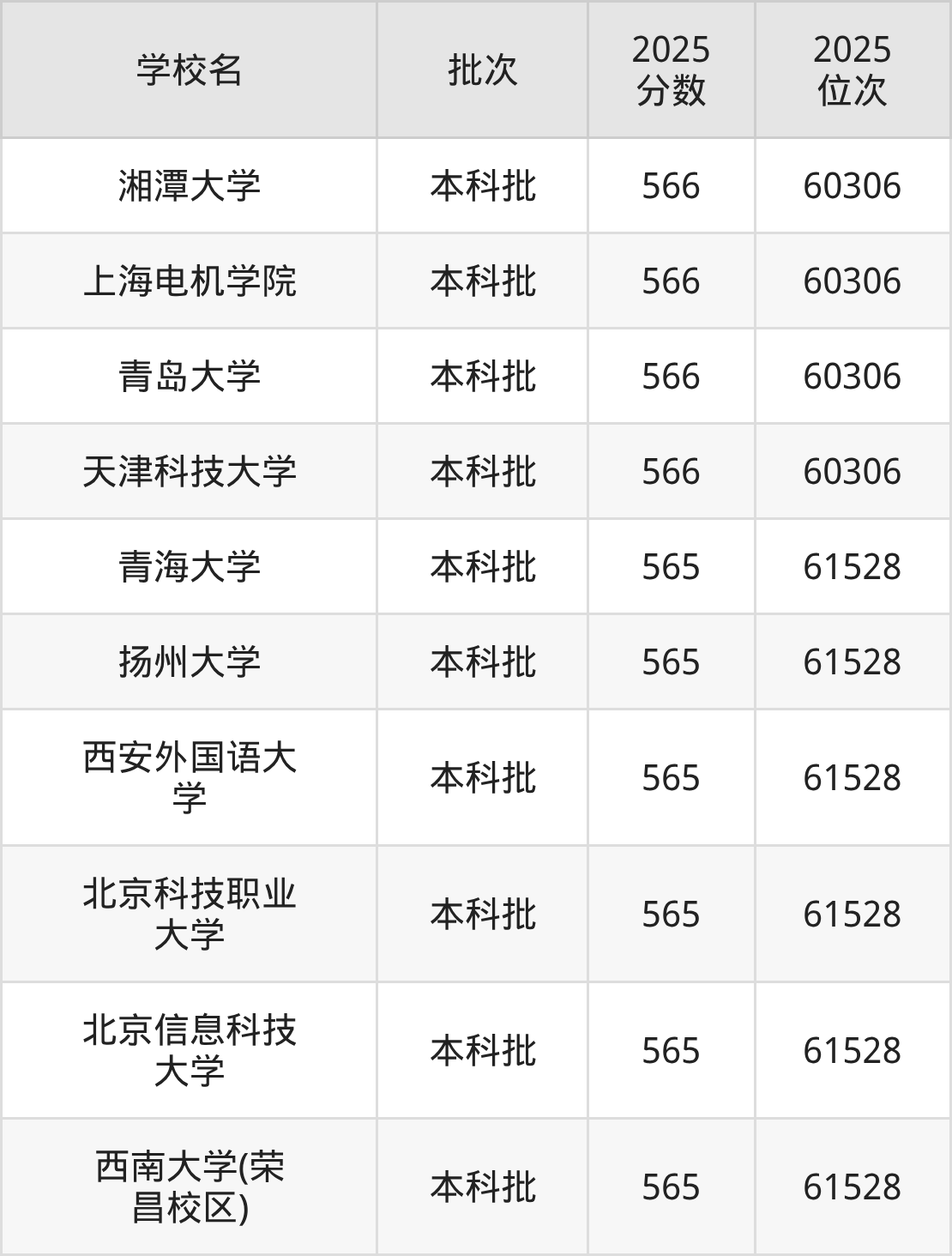 2025年河北高考物理类565分(60307名~61528名)能上的大学有扬州大学、西安外国语大学、北京科技职业大学、青海大学等。