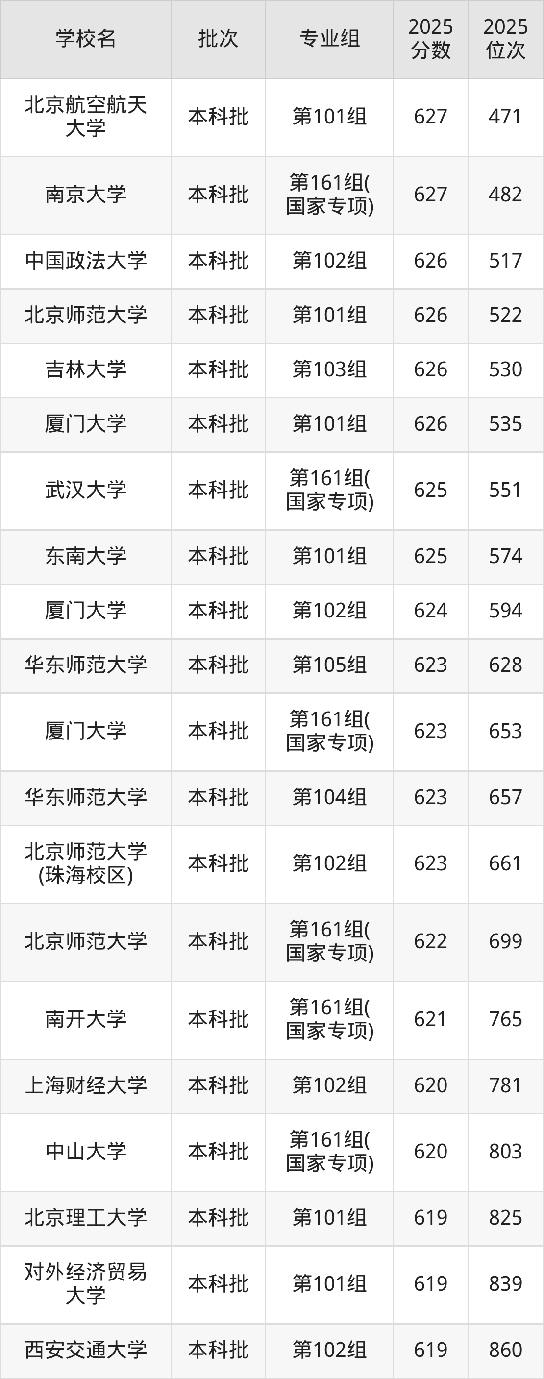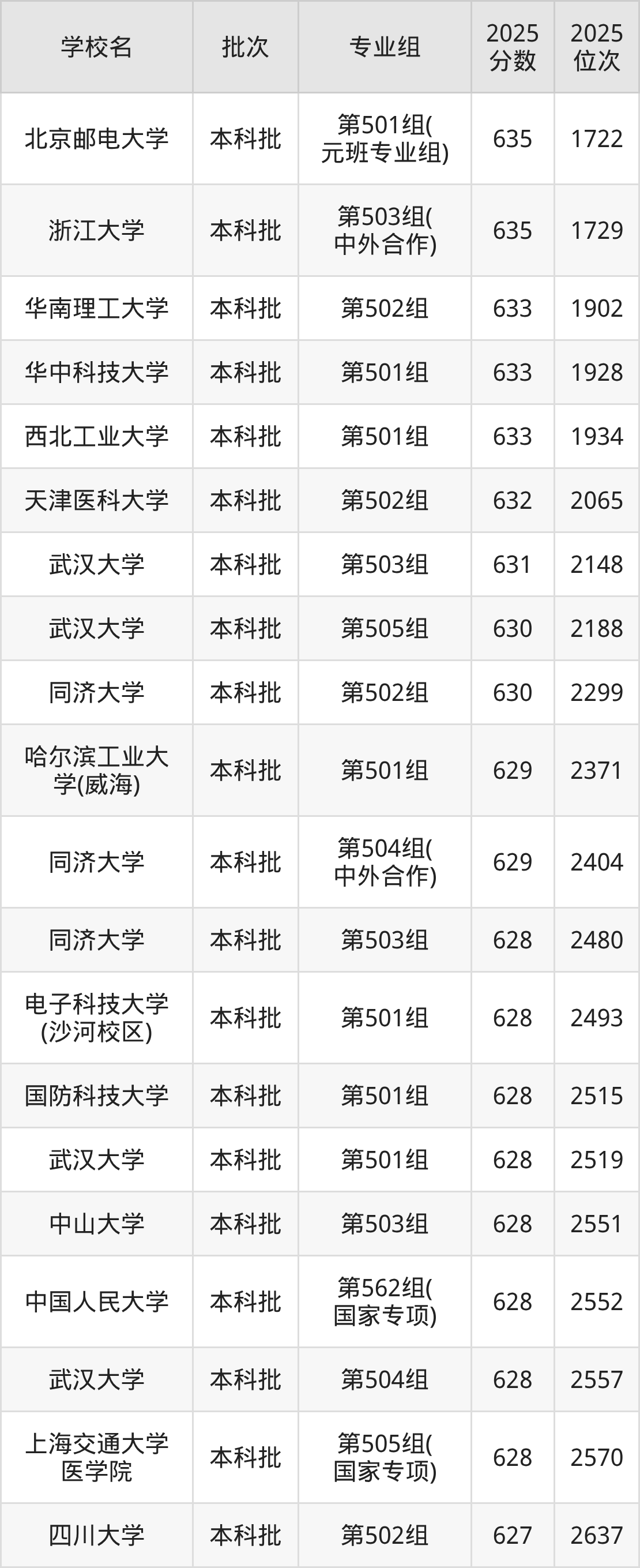 2025年江西高考物理类630分(2184名~2312名)能上的大学有同济大学第502组、武汉大学第505组。