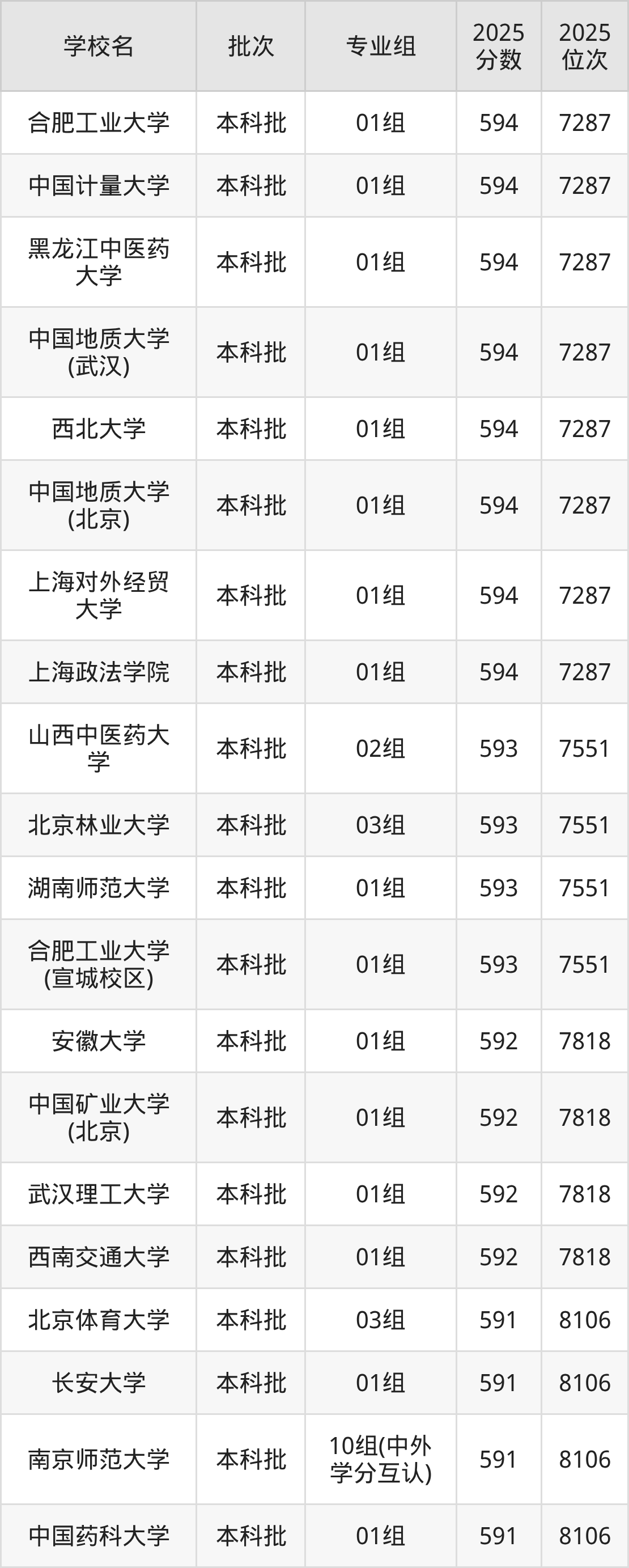 2025年江苏高考历史类592分(7552名~7818名)能上的大学有安徽大学01组、中国矿业大学(北京)01组、武汉理工大学01组、西南交通大学01组。
