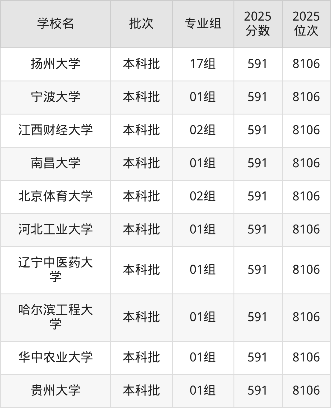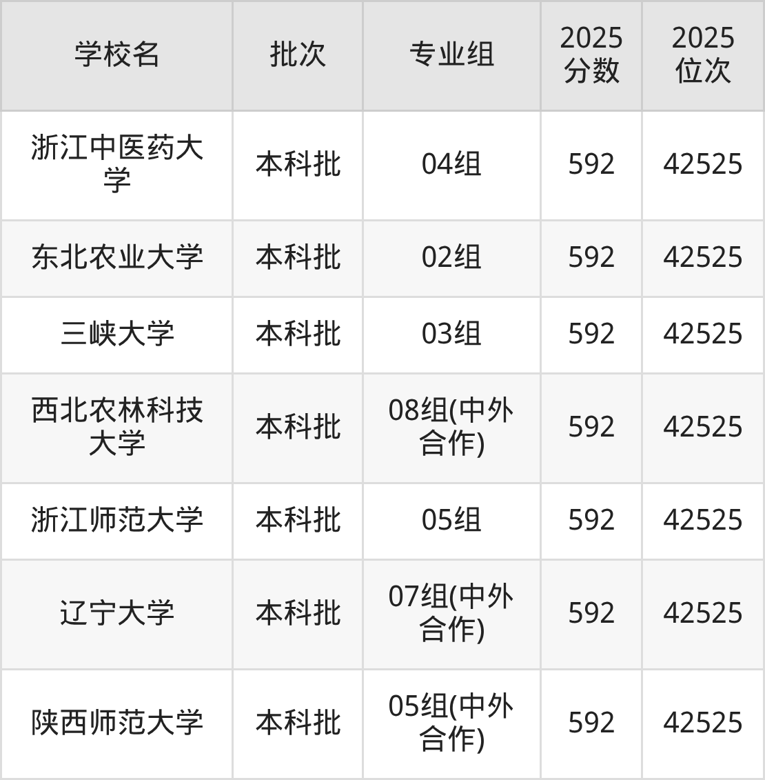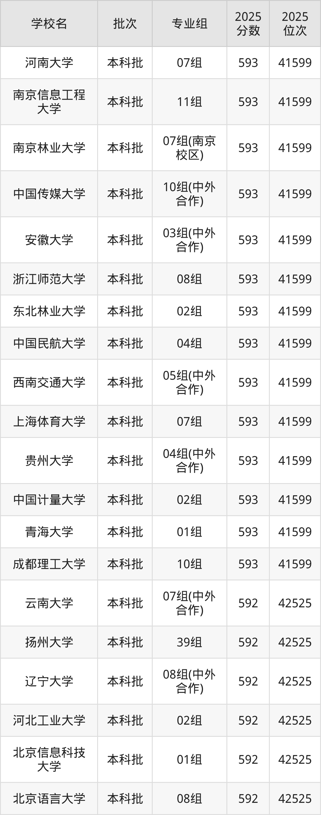 2025年江苏高考物理类592分(41600名~42525名)能上的大学有扬州大学39组、浙江师范大学05组、浙江中医药大学04组、北京语言大学08组等。