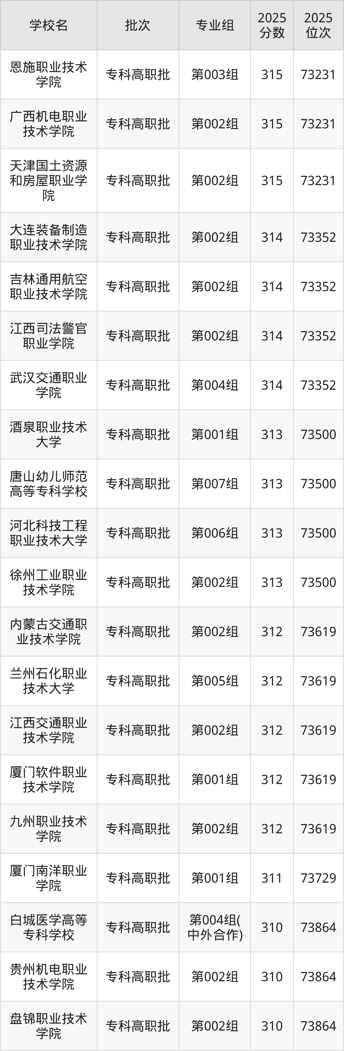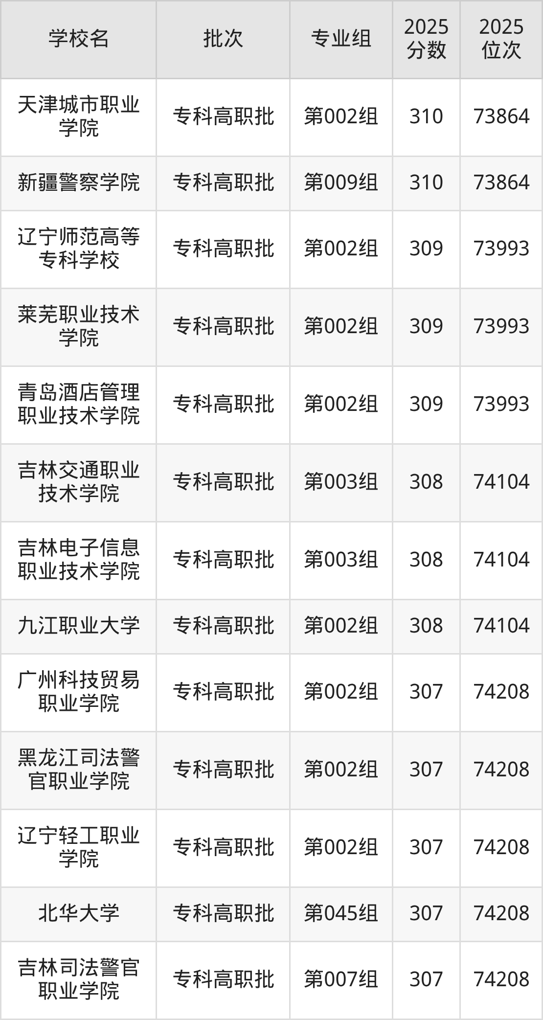 2025年吉林高考物理类310分(73730名~73864名)能上的大学有天津城市职业学院第002组、盘锦职业技术学院第002组、白城医学高等专科学校第004组(中外合作)、贵州机电职业技术学院第002组等。