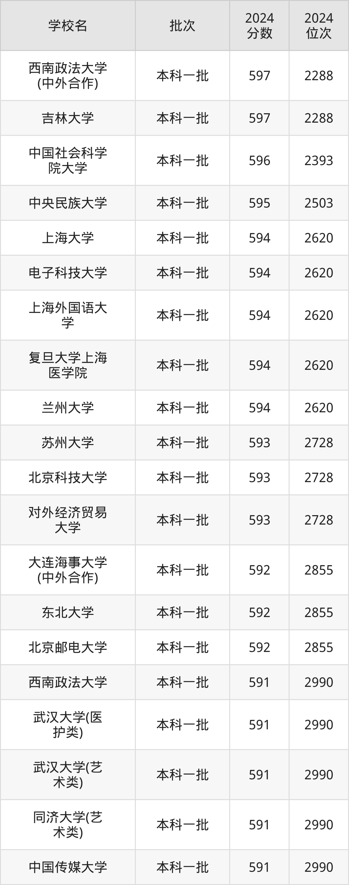 这些都是2025年高考文科2729名~2855名考生可以报考的大学,更多学校名单如下表所示: