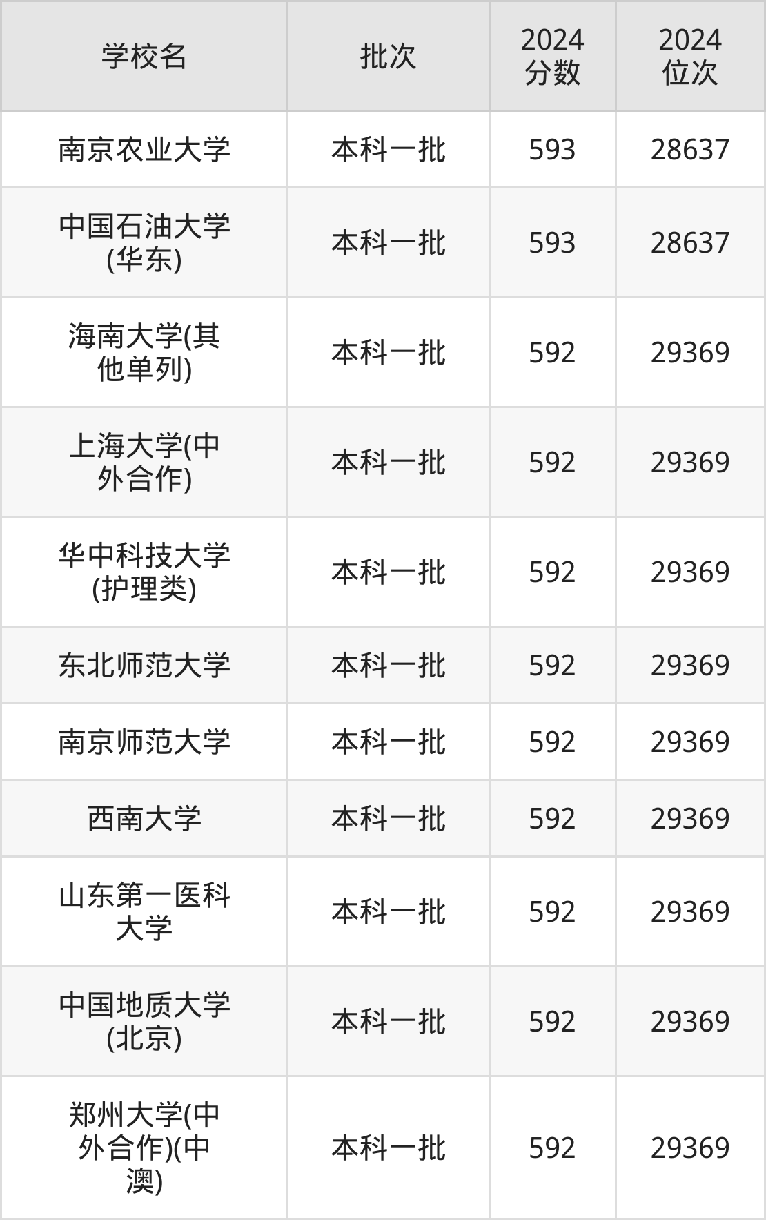 2024年河南高考理科592分(28638名~29369名)能上的大学有中国地质大学(北京)、西南大学、东北师范大学、南京师范大学等。