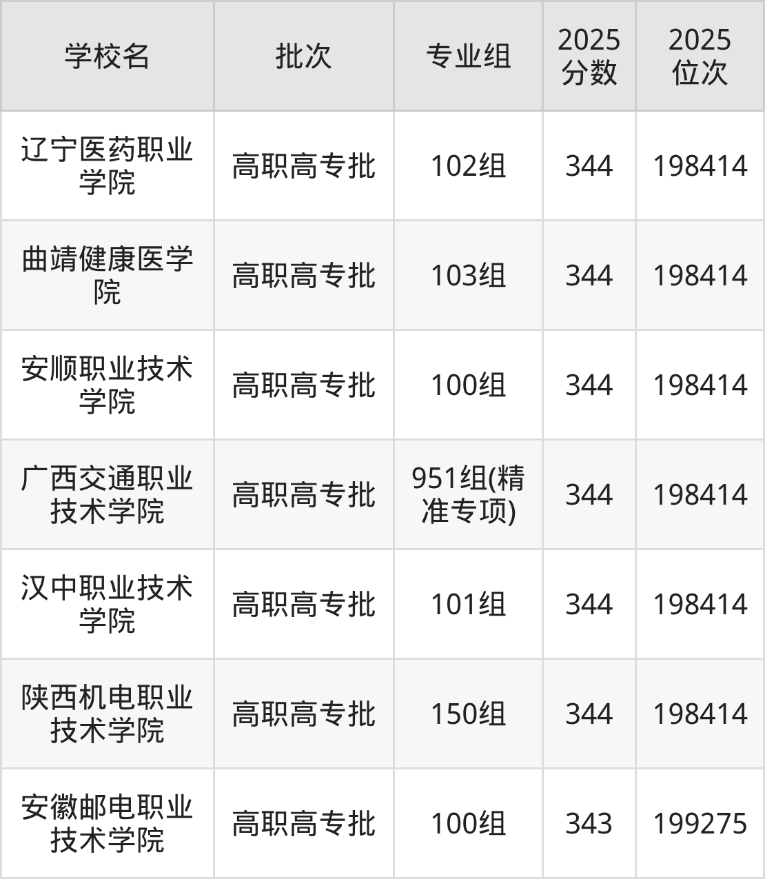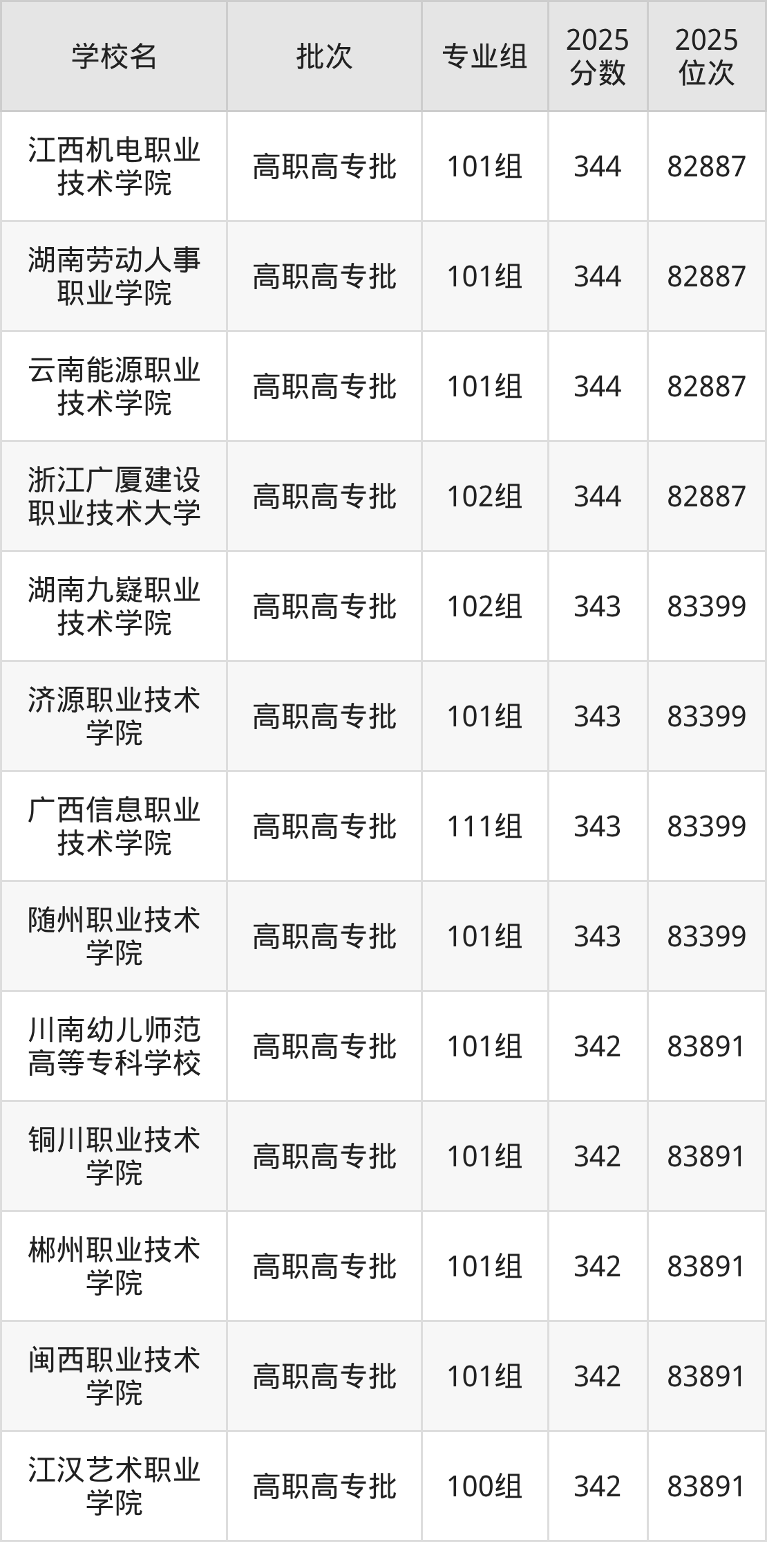 2025年广西高考历史类343分(82888名~83399名)能上的大学有济源职业技术学院101组、随州职业技术学院101组、湖南九嶷职业技术学院102组、广西信息职业技术学院111组。