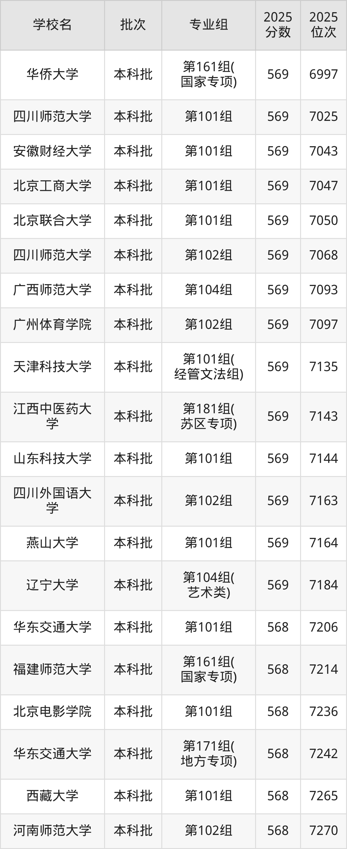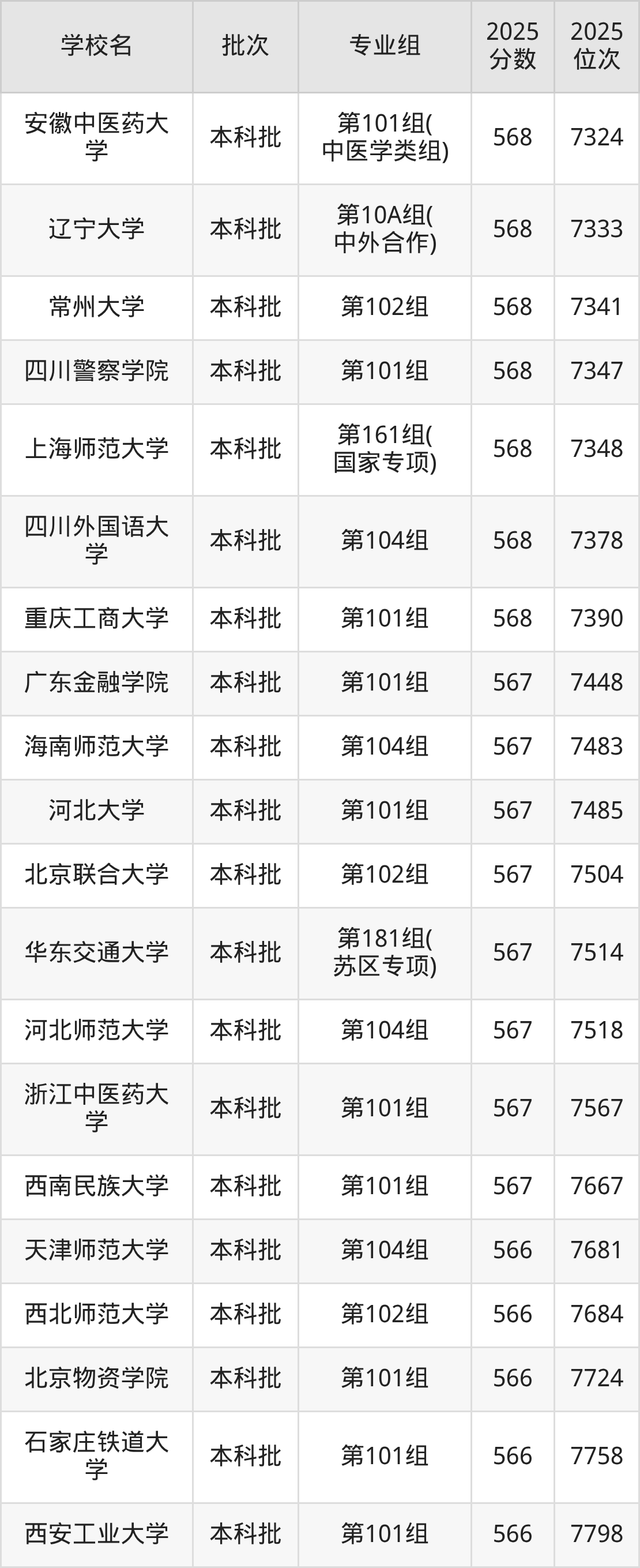 2025年江西高考历史类568分(7189名~7427名)能上的大学有福建师范大学第161组(国家专项)、河南师范大学第102组、辽宁大学第10A组(中外合作)、西藏大学第101组等。