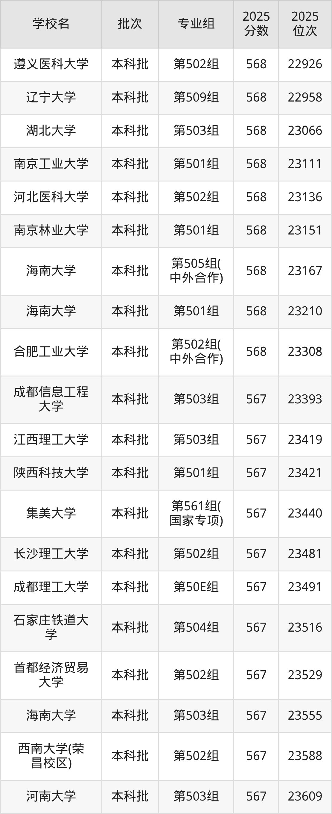 2025年江西高考物理类568分(22778名~23330名)能上的大学有辽宁大学第509组、中国矿业大学第561组(国家专项)、合肥工业大学第502组(中外合作)、华中农业大学第561组(国家专项)等。