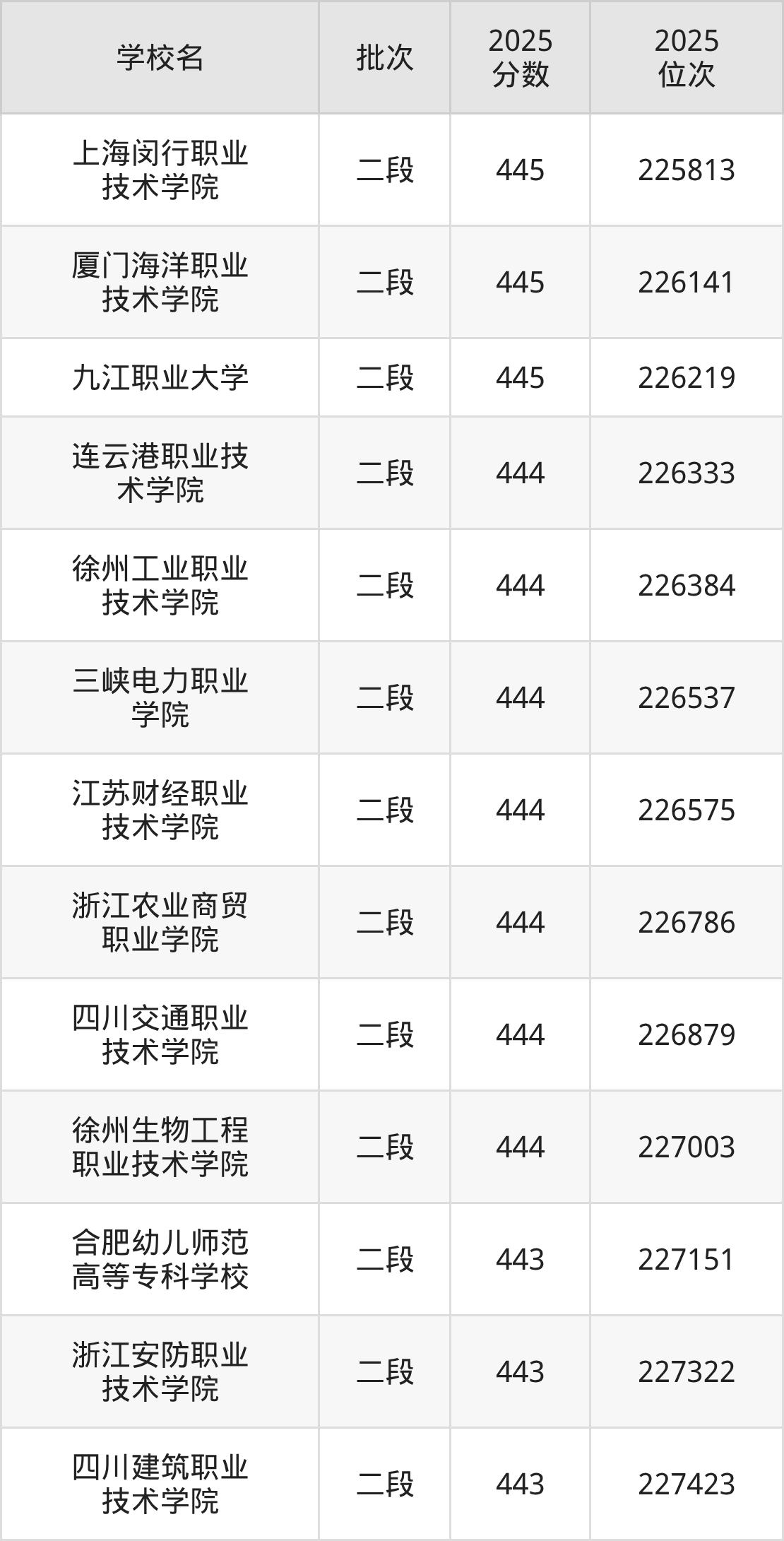 2025年浙江高考444分(226283名~227042名)能上的大学有连云港职业技术学院、浙江农业商贸职业学院、徐州工业职业技术学院、四川交通职业技术学院等。