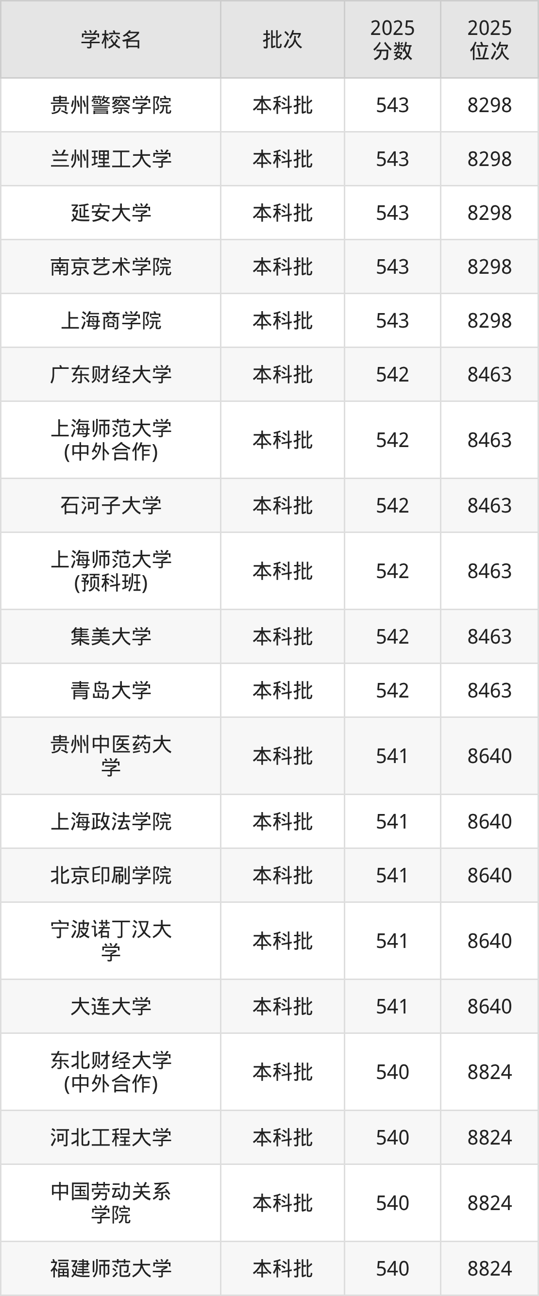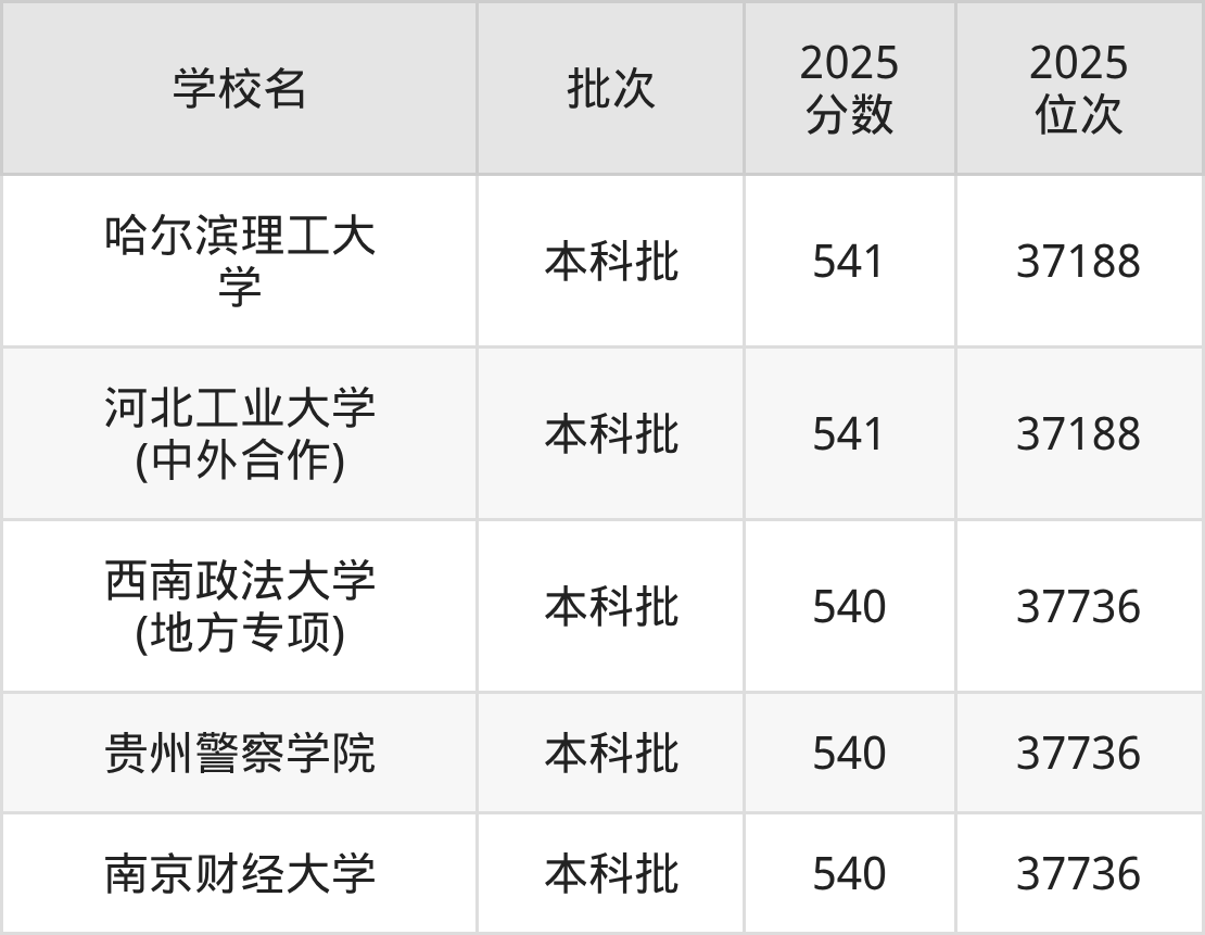 2025年重庆高考物理类540分(37189名~37736名)能上的大学有西南政法大学(地方专项)、贵州警察学院、南京财经大学。
