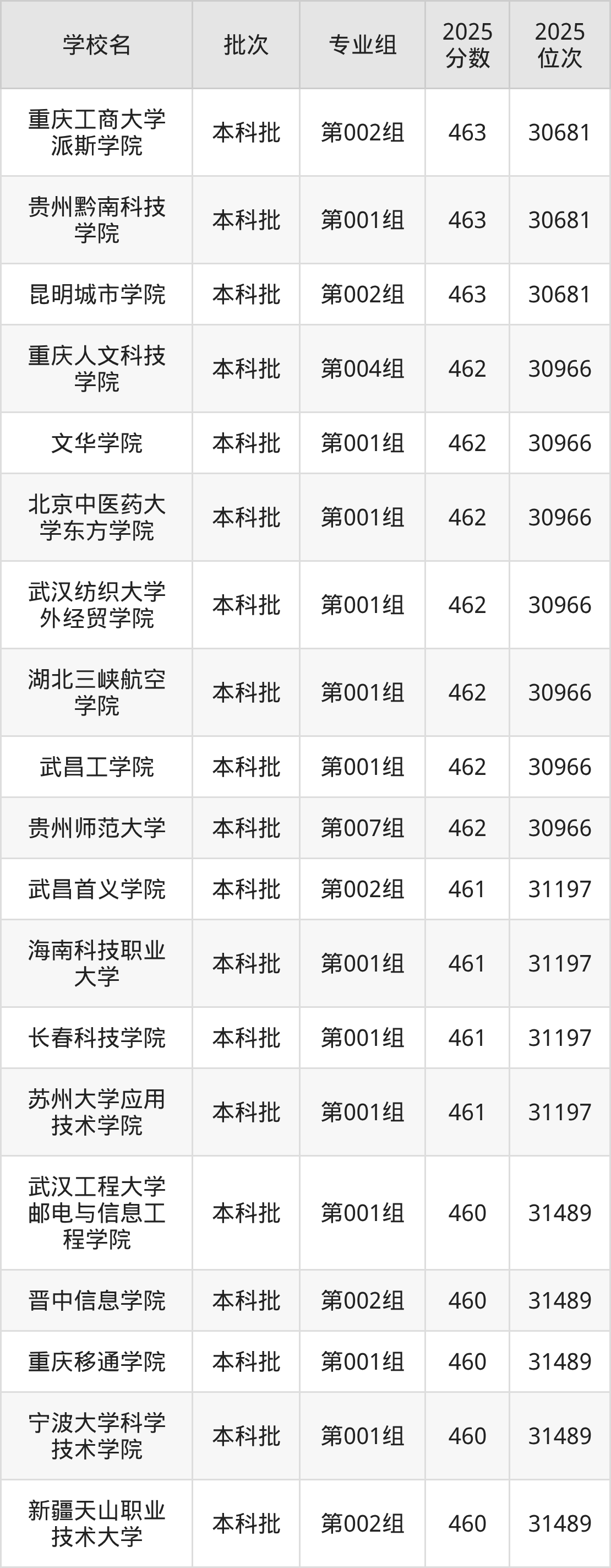 2025年山西高考历史类461分(30967名~31197名)能上的大学有长春科技学院第001组、苏州大学应用技术学院第001组、武昌首义学院第002组、海南科技职业大学第001组等。