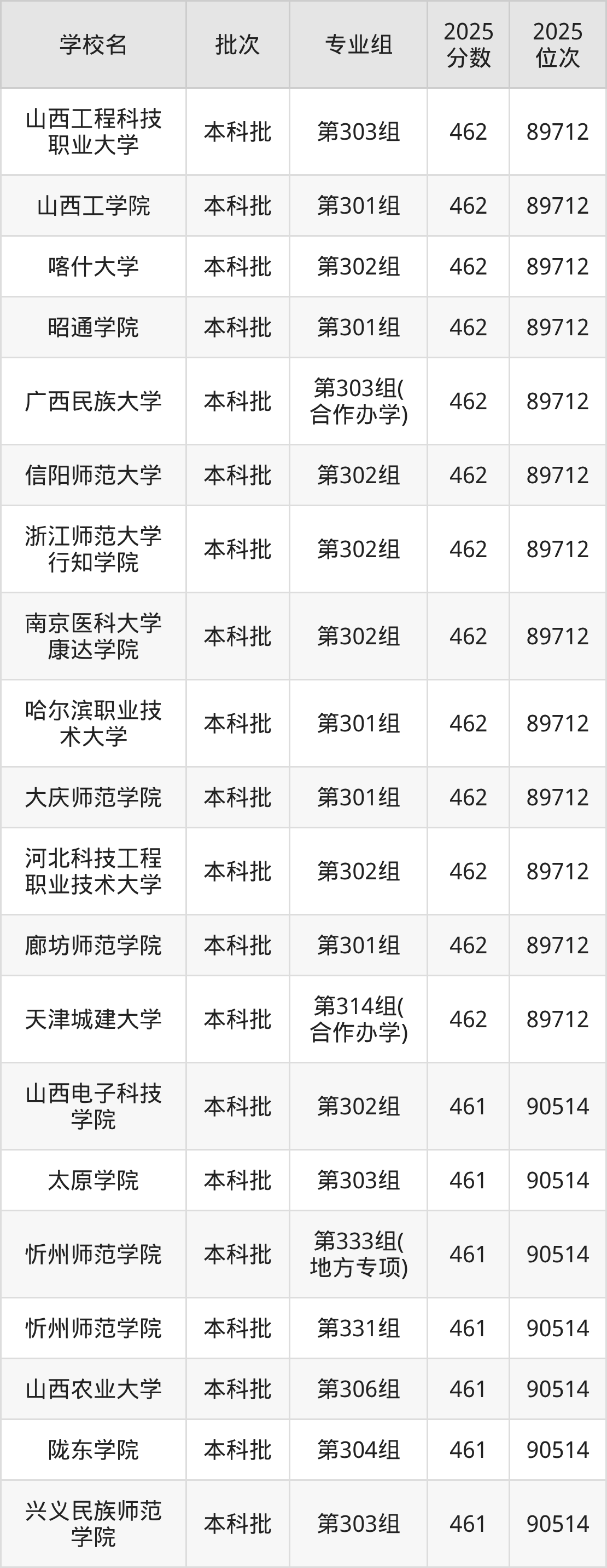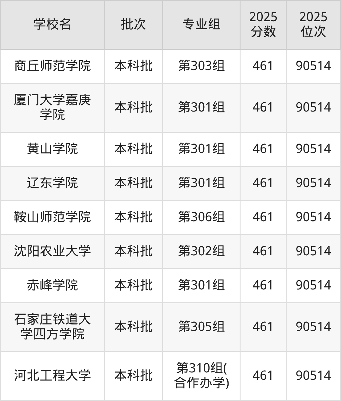 2025年山西高考物理类461分(89713名~90514名)能上的大学有河北工程大学第310组(合作办学)、石家庄铁道大学四方学院第305组、赤峰学院第301组、沈阳农业大学第302组等。