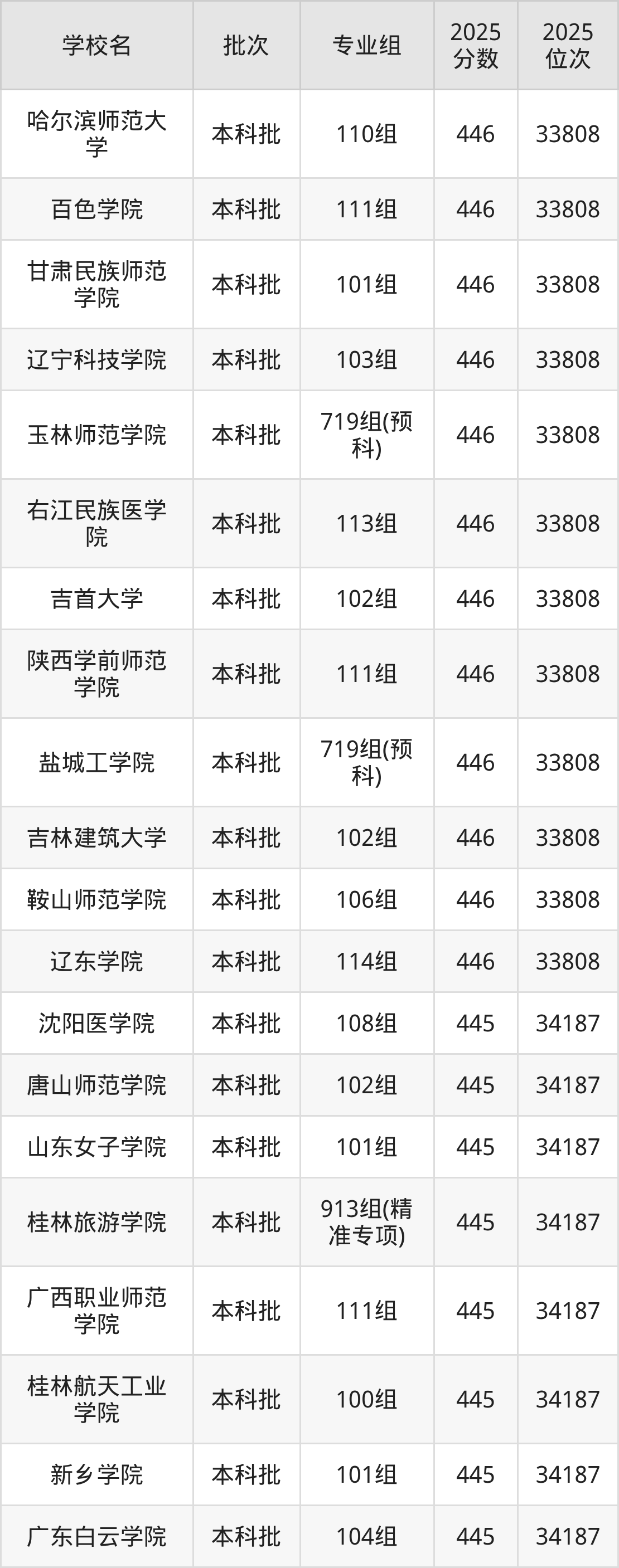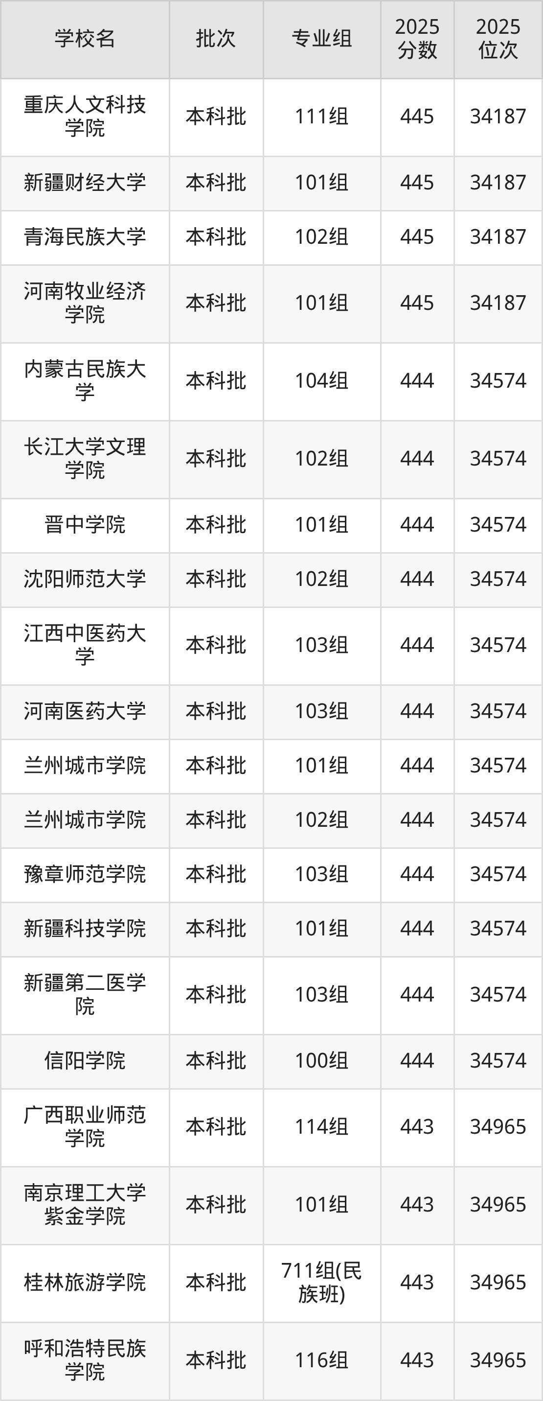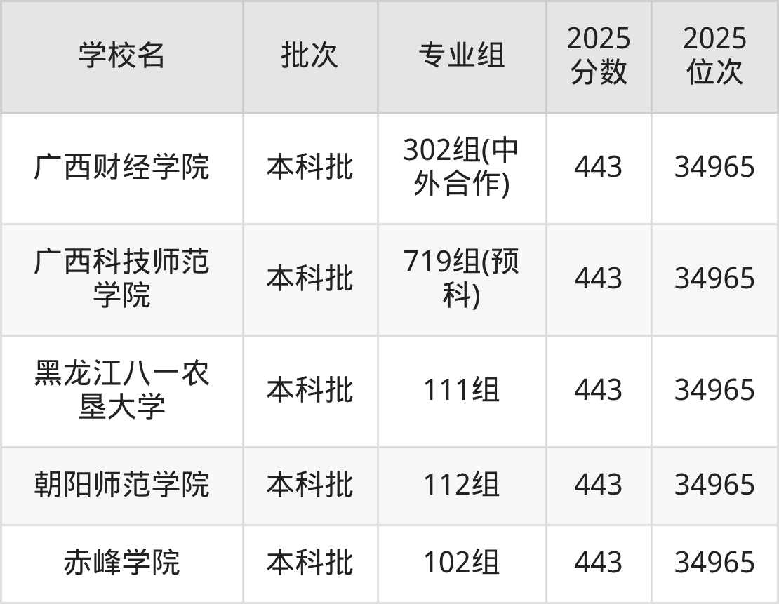 2025年广西高考历史类444分(34188名~34574名)能上的大学有晋中学院101组、内蒙古民族大学104组、沈阳师范大学102组、江西中医药大学103组等。