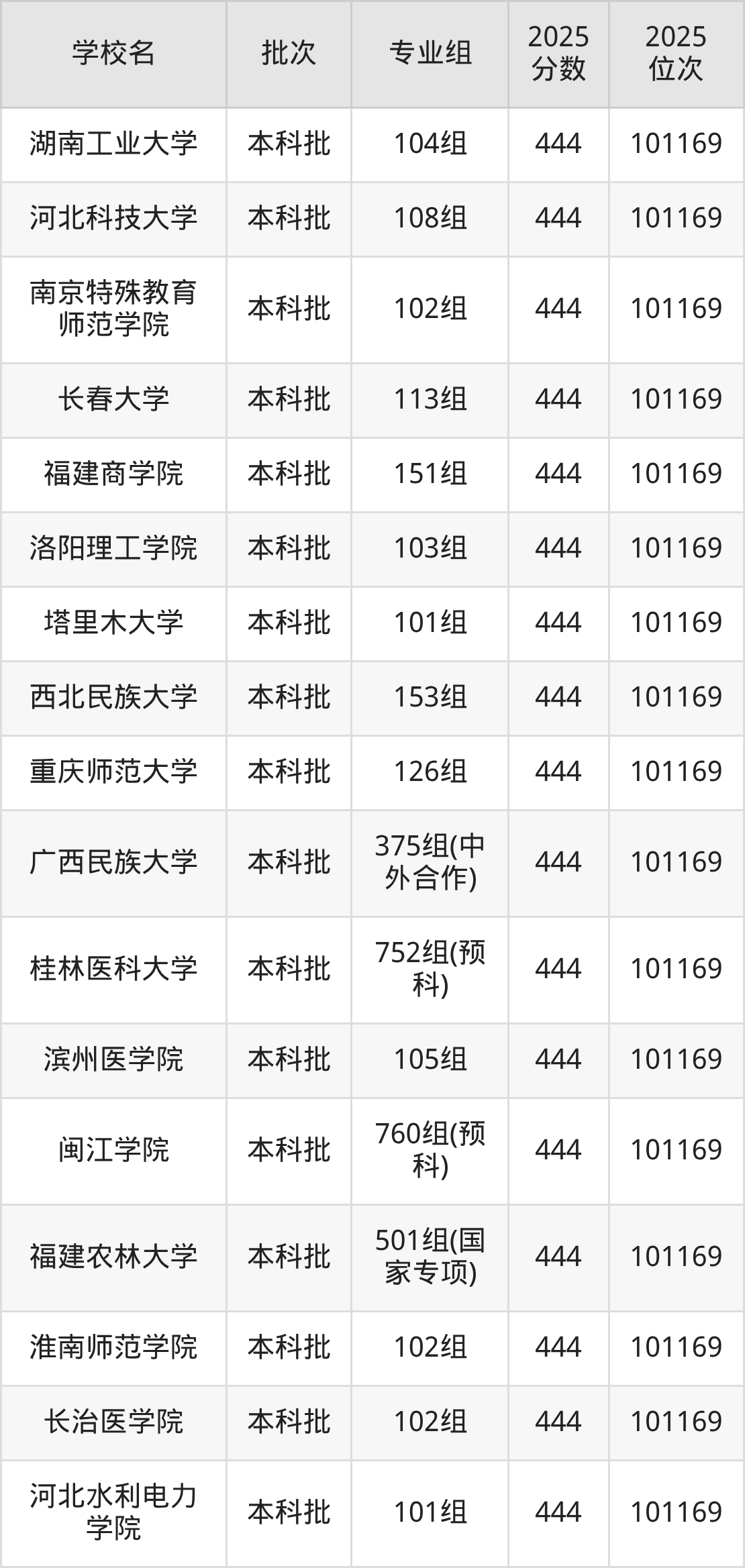 2025年广西高考物理类444分(100280名~101169名)能上的大学有河北科技大学108组、河北水利电力学院101组、长治医学院102组、淮南师范学院102组等。