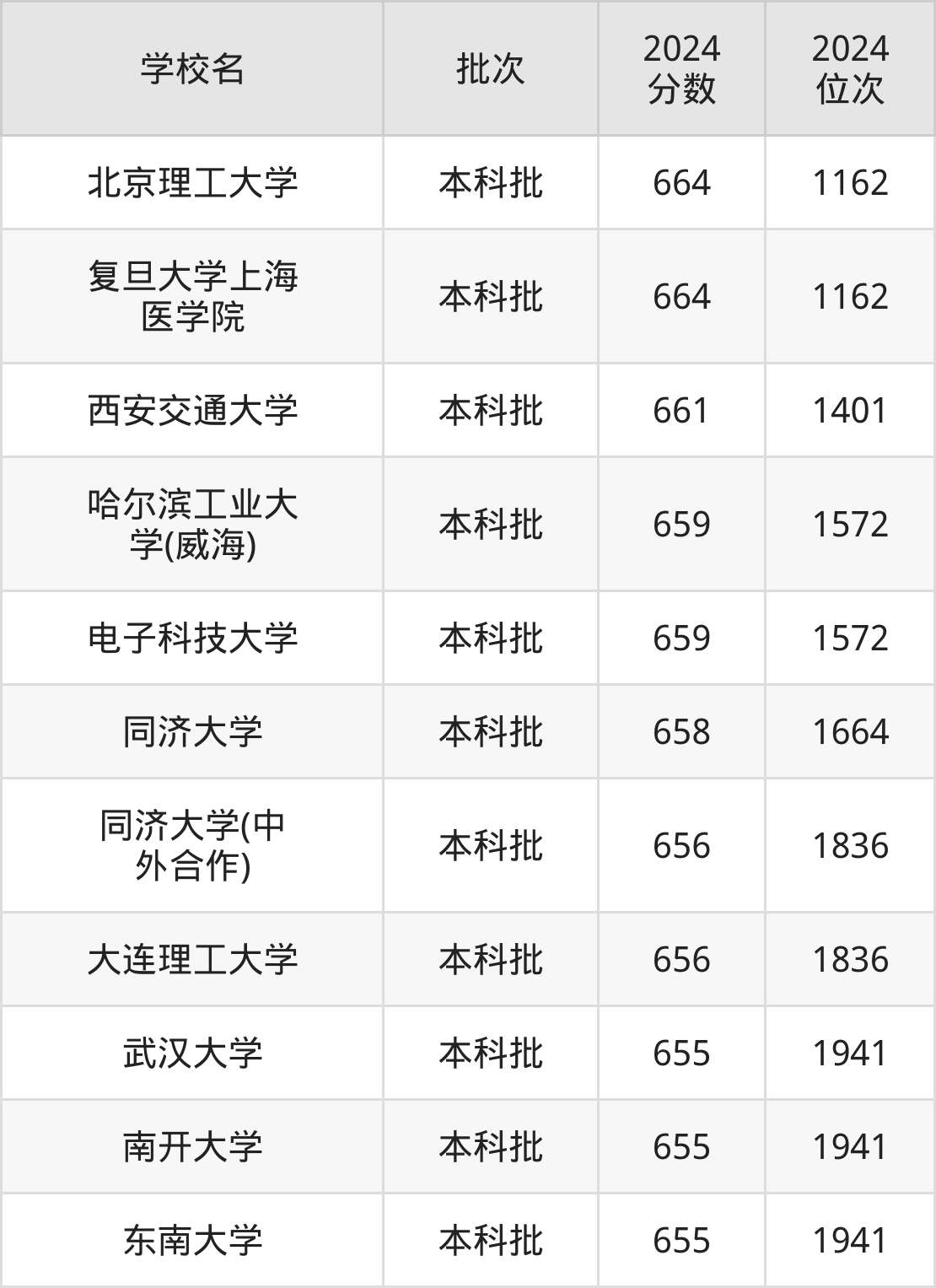 2024年重庆高考物理类660分(1402名~1489名)录取位次低于该区间(较稳妥)的有哈尔滨工业大学(威海)(1572名)、电子科技大学(1572名)等;录取位次高于该区间(可冲)的有西安交通大学(1401名)、北京理工大学(1162名)等。
