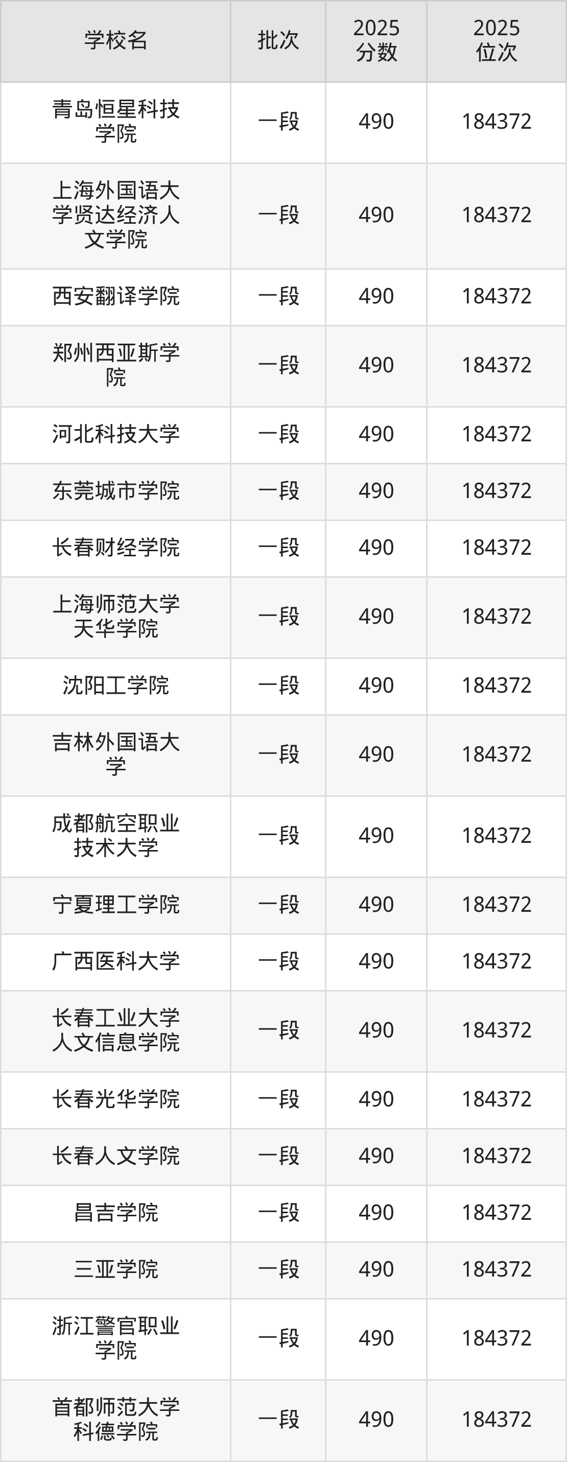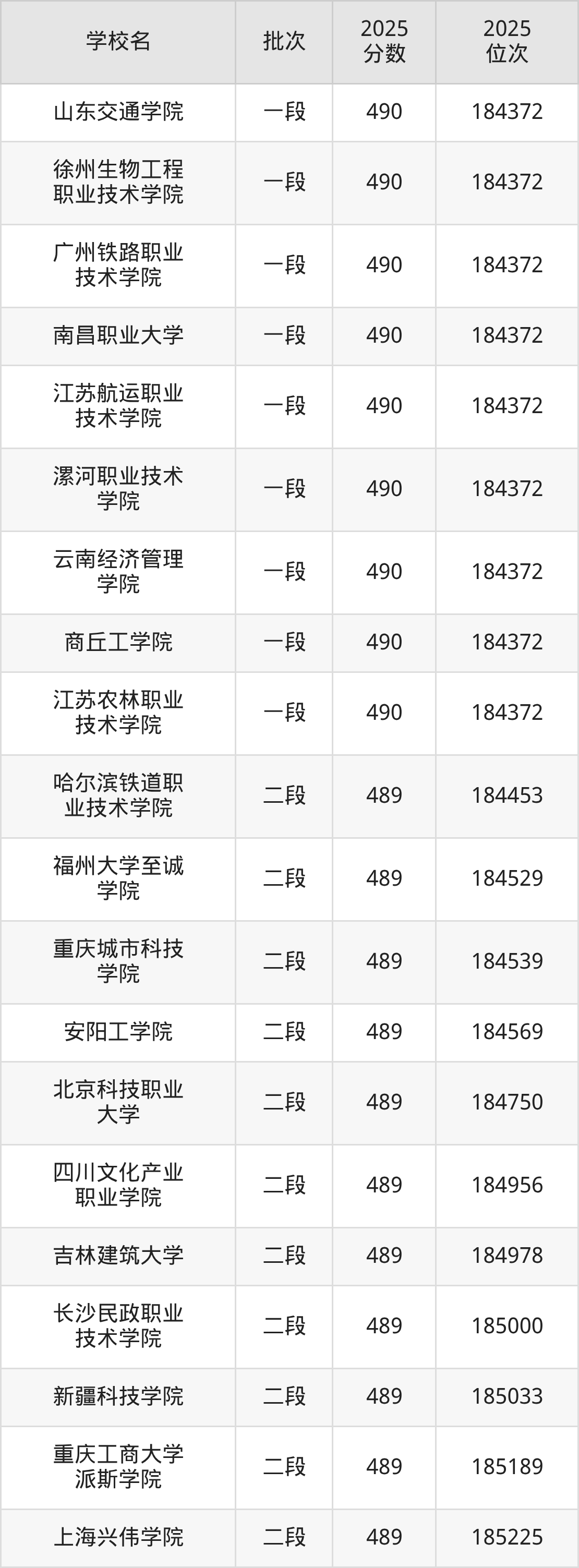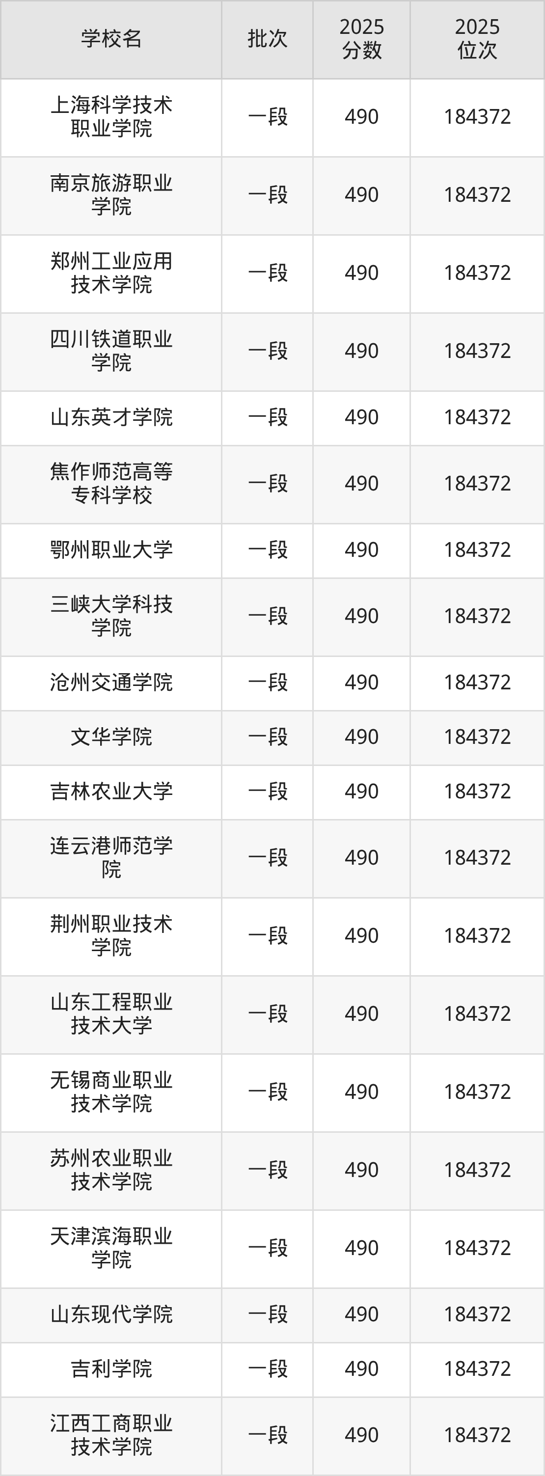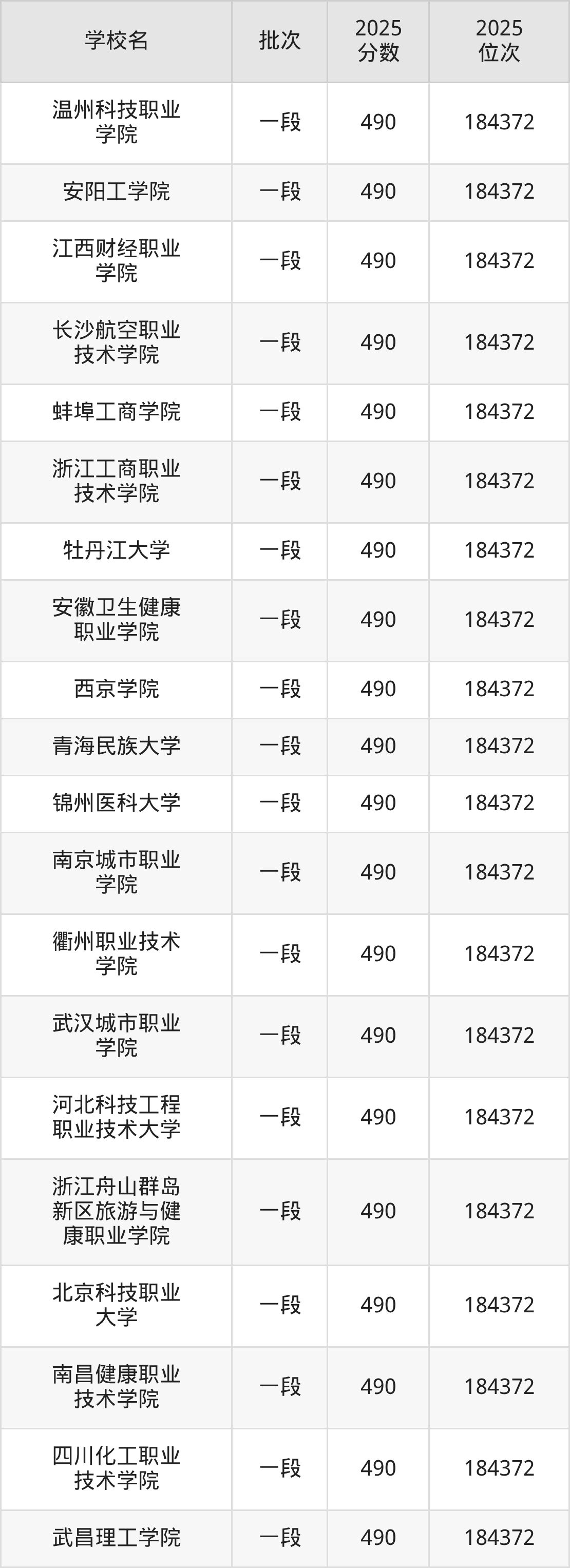 2025年浙江高考489分(184373名~185464名)能上的大学有上海兴伟学院、吉林建筑大学、北京科技职业大学、安阳工学院等。