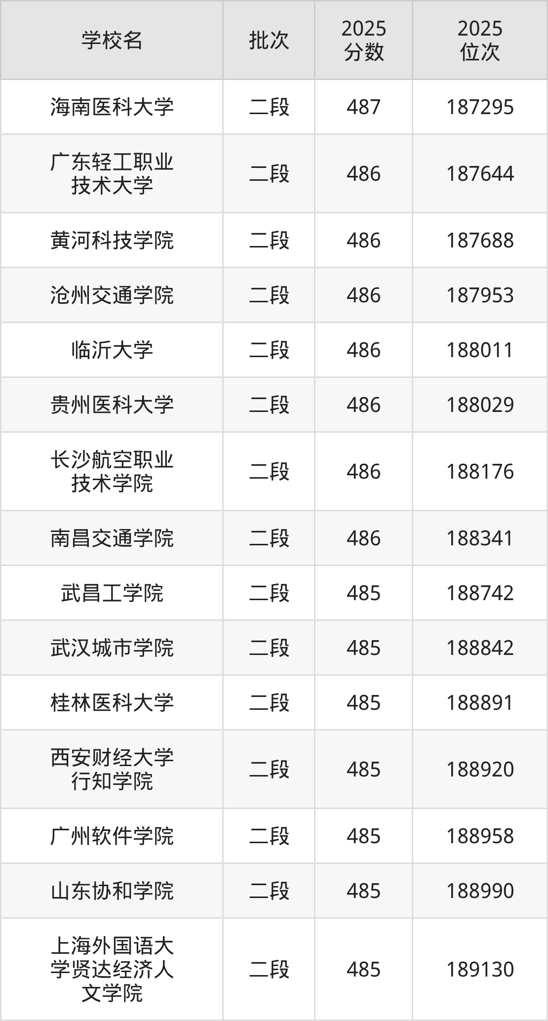 2025年浙江高考486分(187637名~188688名)能上的大学有沧州交通学院、广东轻工职业技术大学、临沂大学、南昌交通学院等。