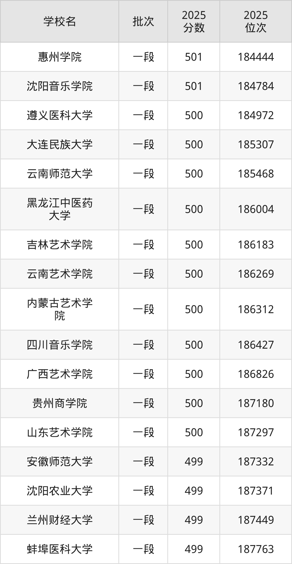 2025年山东高考500分(184941名~187310名)能上的大学有内蒙古艺术学院、广西艺术学院、云南艺术学院、吉林艺术学院等。