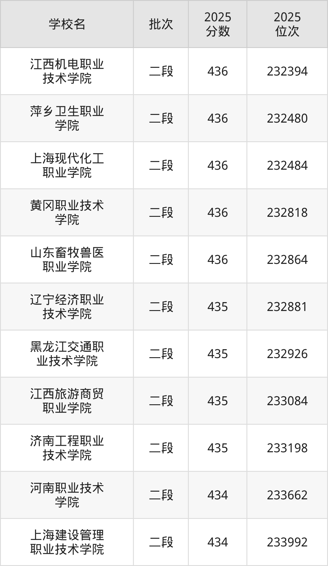 2025年浙江高考435分(232867名~233553名)能上的大学有江西旅游商贸职业学院、辽宁经济职业技术学院、黑龙江交通职业技术学院、济南工程职业技术学院。