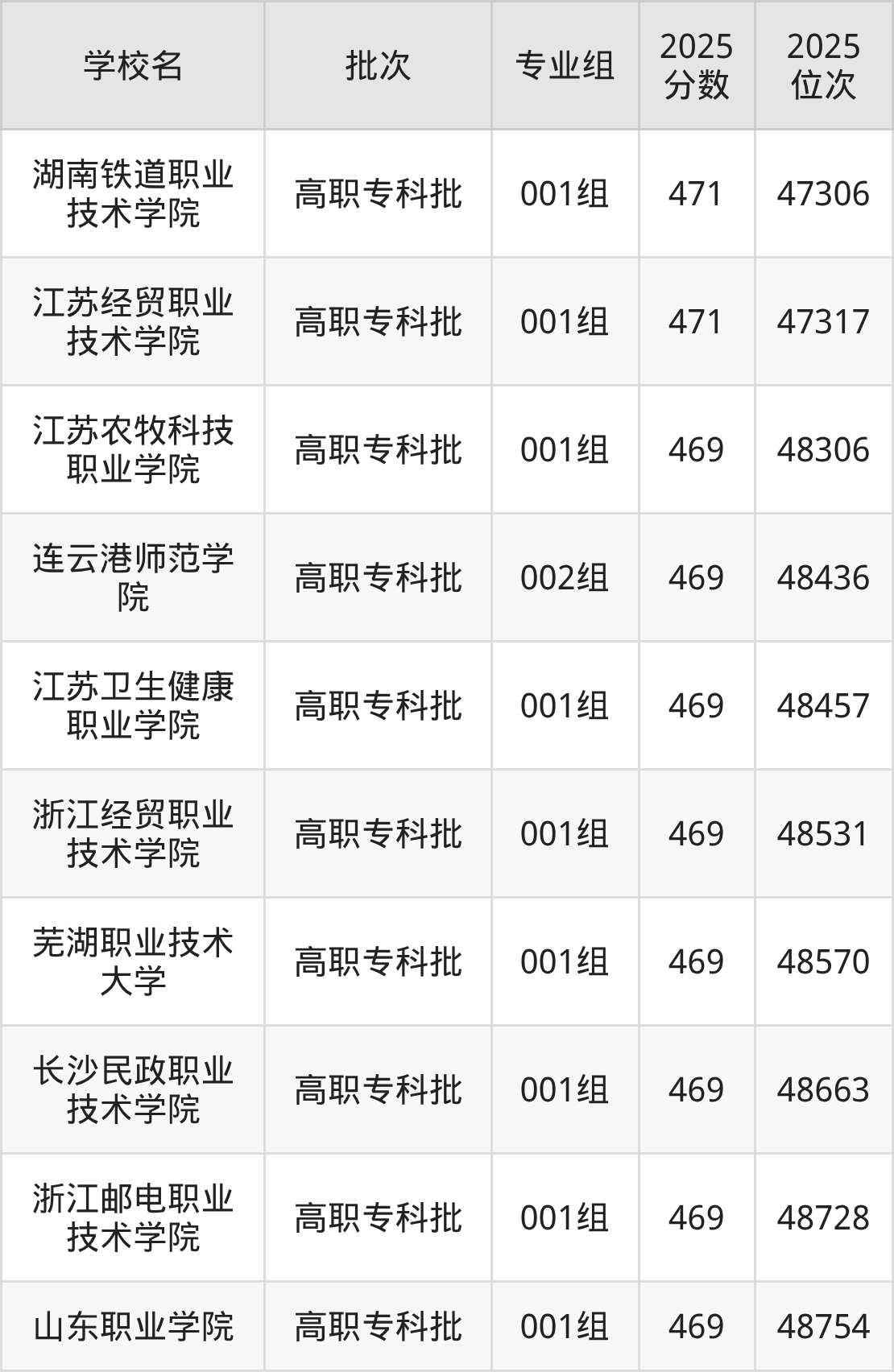 2025年安徽高考历史类470分(47776名~48285名)录取位次低于该区间(较稳妥)的有江苏农牧科技职业学院001组(48306名)、连云港师范学院002组(48436名)等;录取位次高于该区间(可冲)的有江苏经贸职业技术学院001组(47317名)、湖南铁道职业技术学院001组(47306名)等。