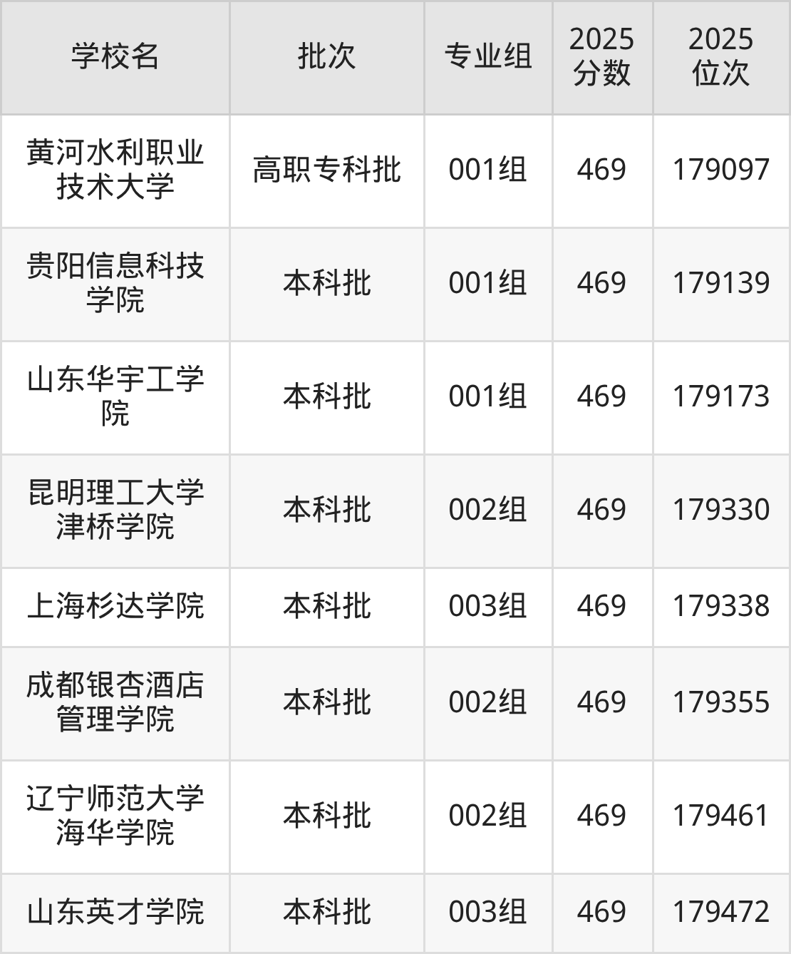 另外录取位次低于该区间(较稳妥)的有黄河水利职业技术大学001组(179097名)、贵阳信息科技学院001组(179139名)等;录取位次高于该区间(可冲)的有岳阳学院003组(177561名)、成都银杏酒店管理学院001组(177467名)等。