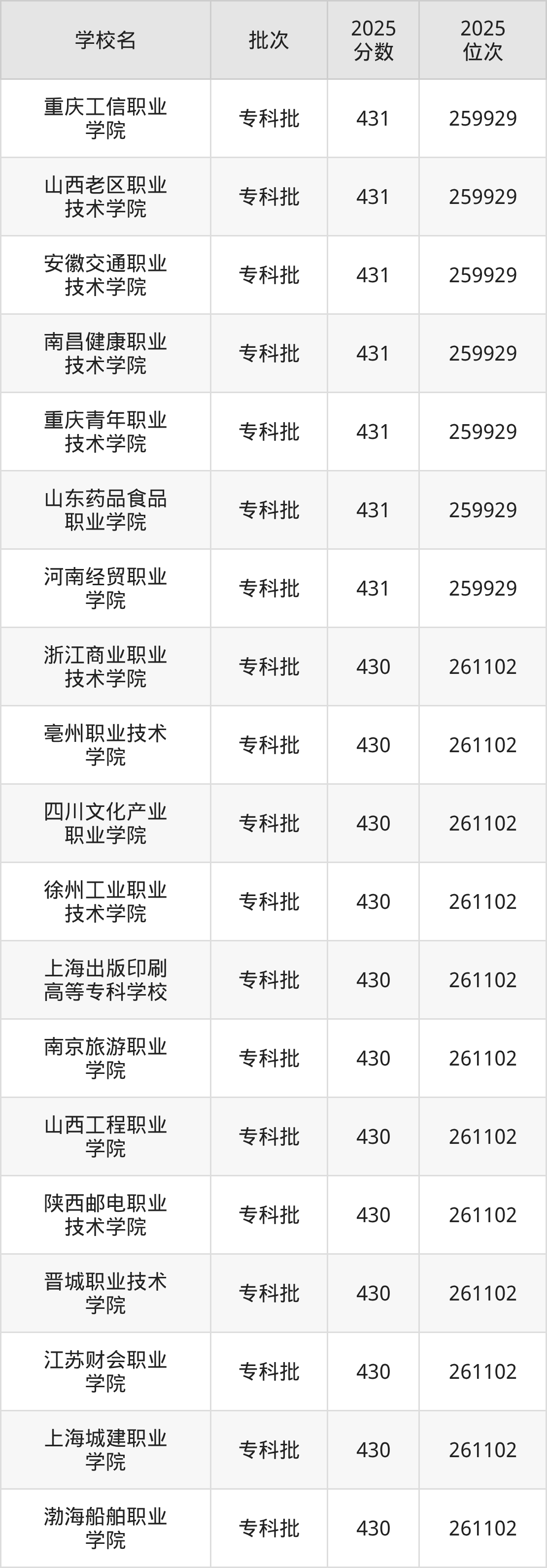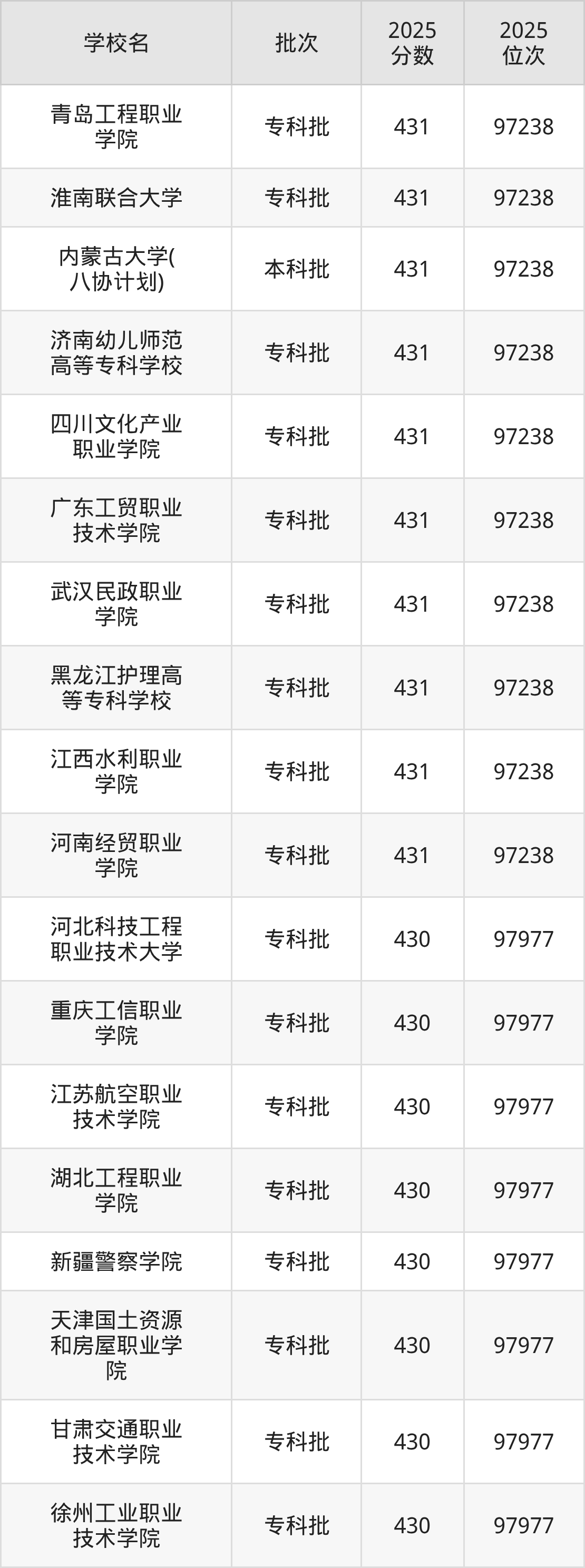 2025年河北高考历史类430分(97239名~97977名)能上的大学有天津国土资源和房屋职业学院、新疆警察学院、重庆工信职业学院、湖北工程职业学院等。