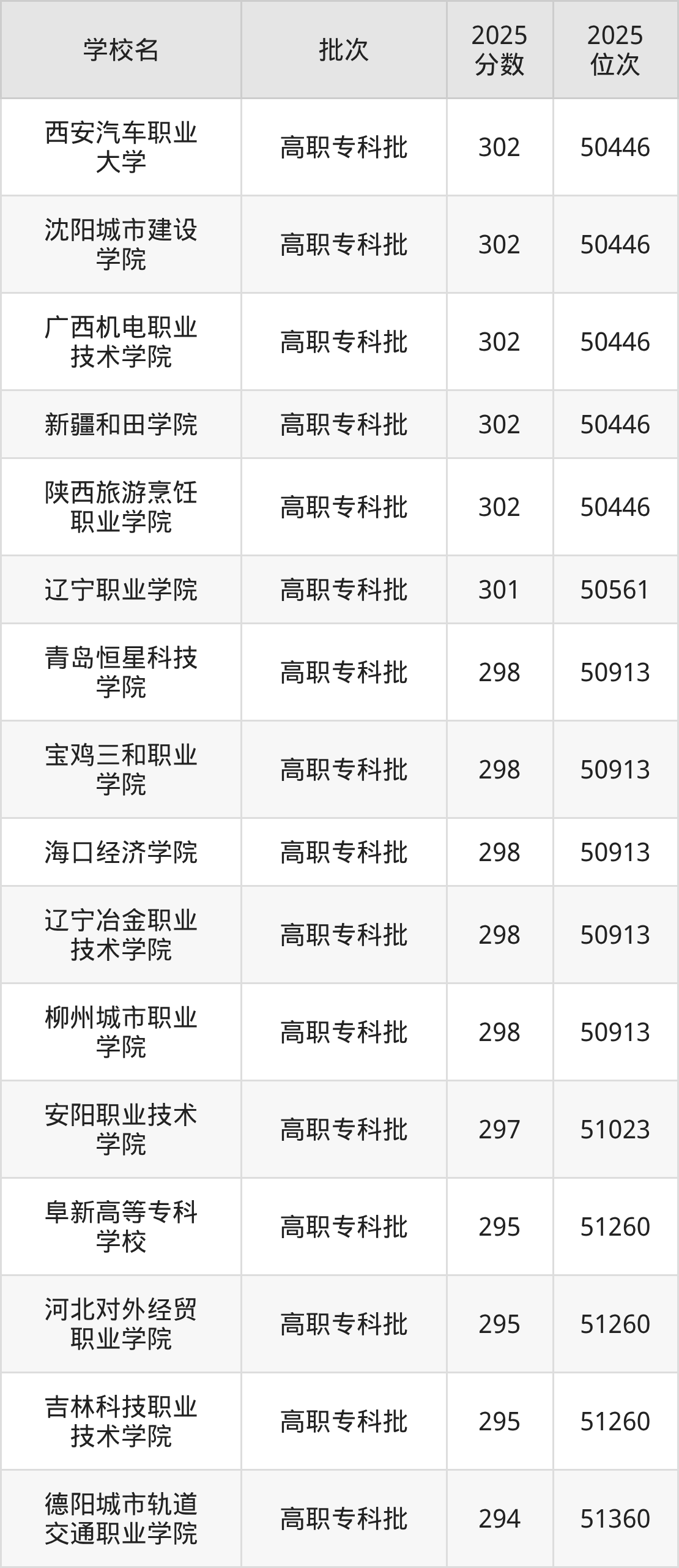 2025年辽宁高考历史类298分(50777名~50913名)能上的大学有柳州城市职业学院、辽宁冶金职业技术学院、海口经济学院、宝鸡三和职业学院等。