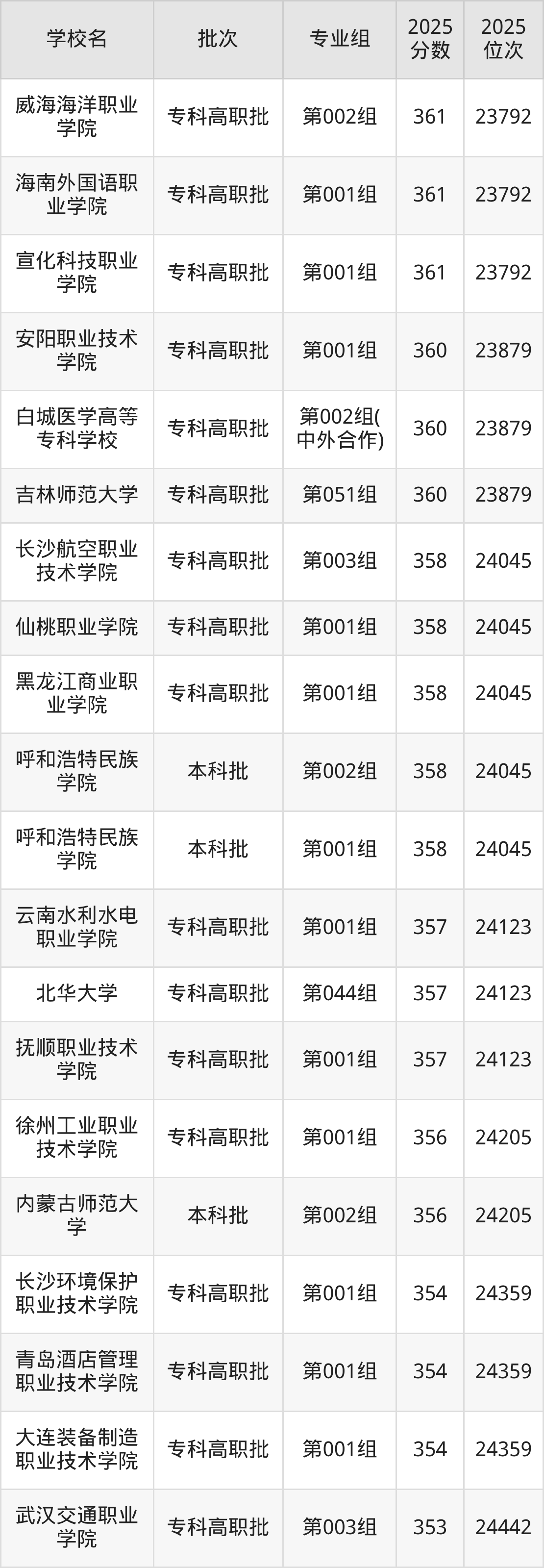 2025年吉林高考历史类359分(23880名~23959名)录取位次低于该区间(较稳妥)的有呼和浩特民族学院第001组(24045名)、长沙航空职业技术学院第003组(24045名)等;录取位次高于该区间(可冲)的有白城医学高等专科学校第002组(中外合作)(23879名)、吉林师范大学第051组(23879名)等。