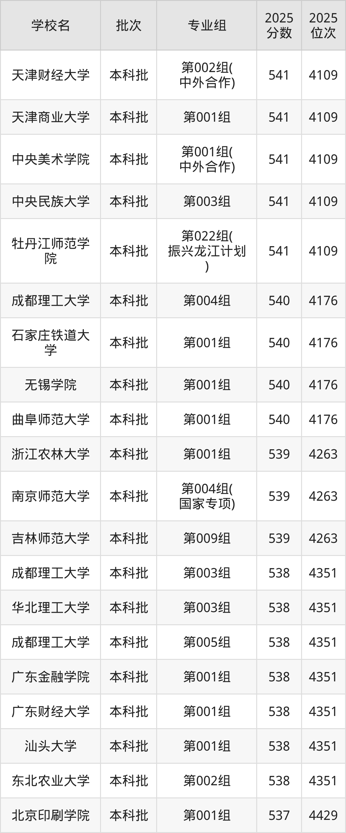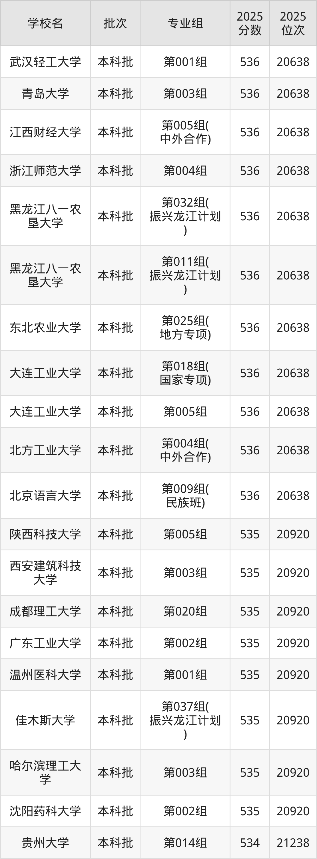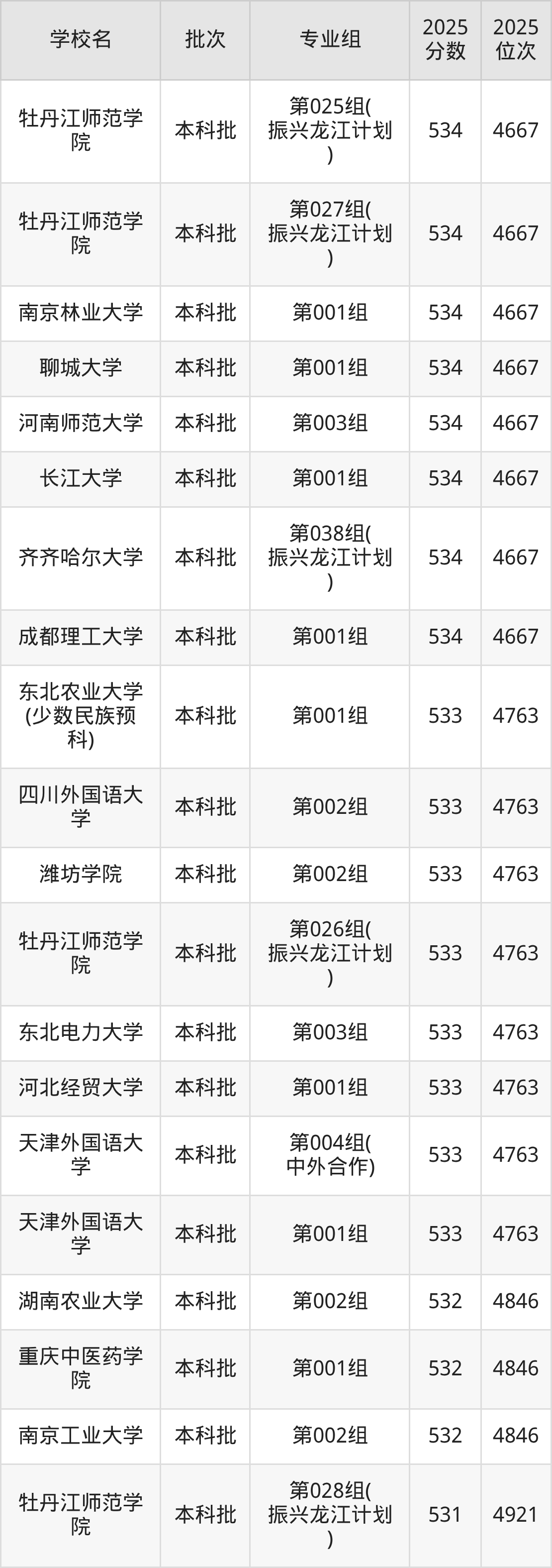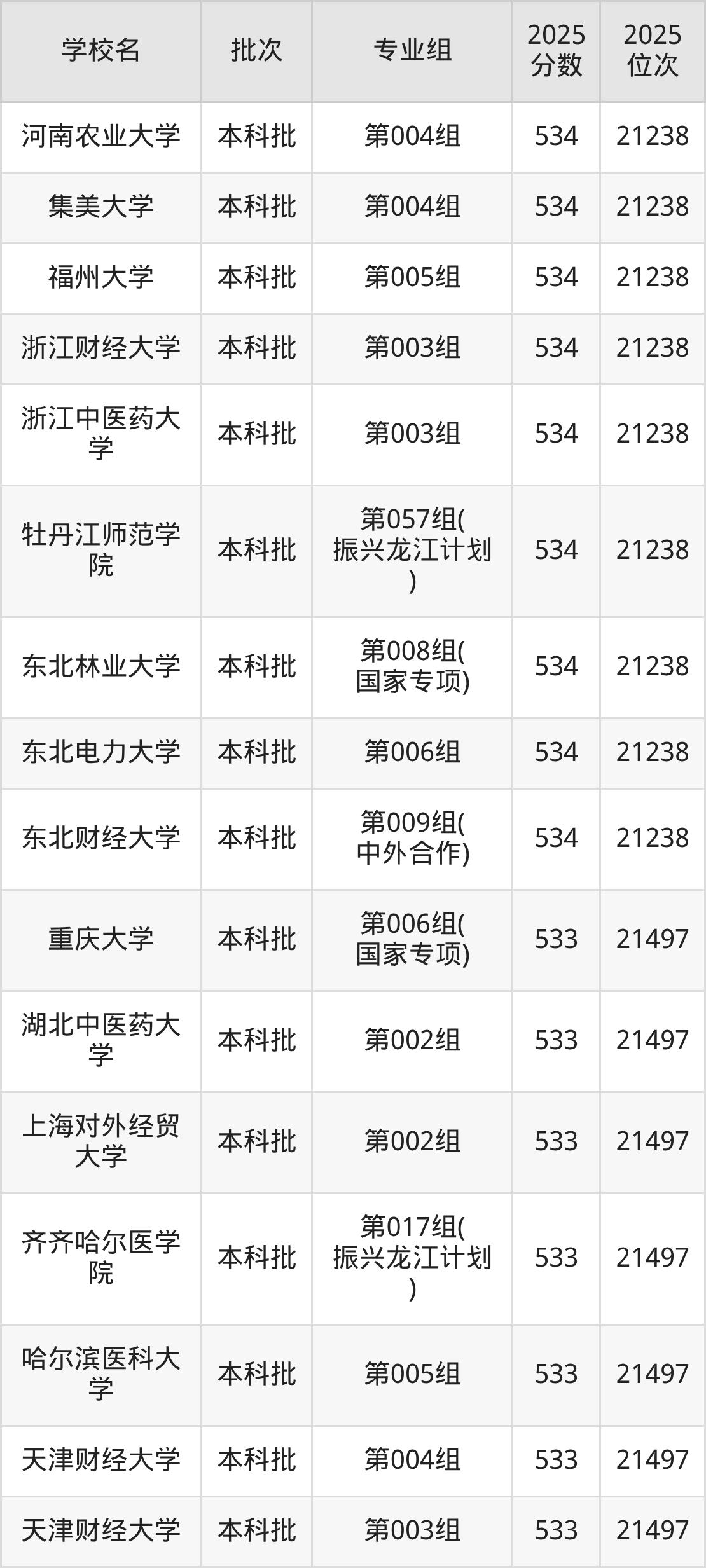 2025年黑龙江高考物理类534分(20921名~21238名)能上的大学有东北财经大学第009组(中外合作)、东北电力大学第006组、东北林业大学第008组(国家专项)、牡丹江师范学院第057组(振兴龙江计划)等。